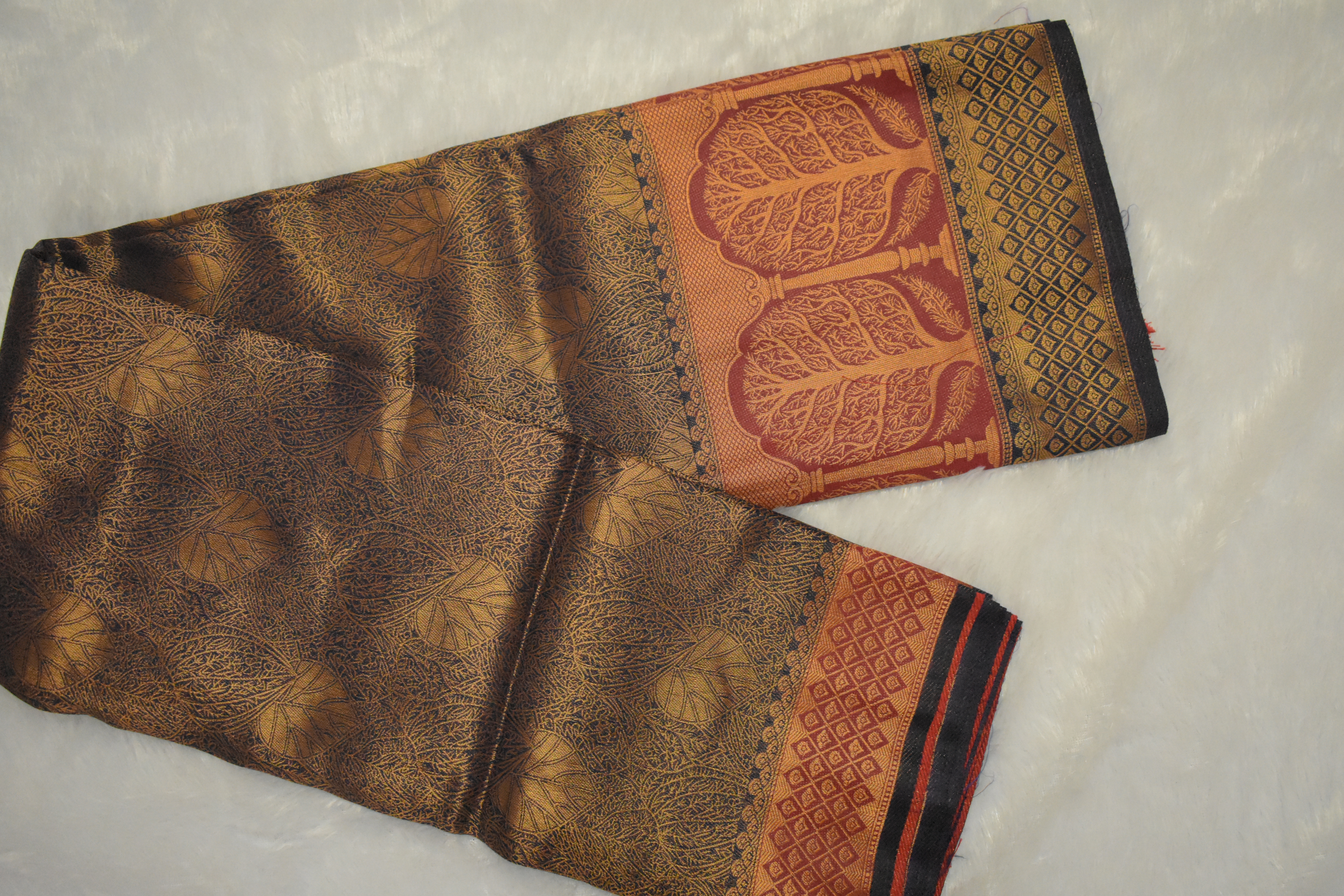 Elevate your ethnic wardrobe with this exquisite Banarasi silk saree in deep brown with contrast maroon and black border...