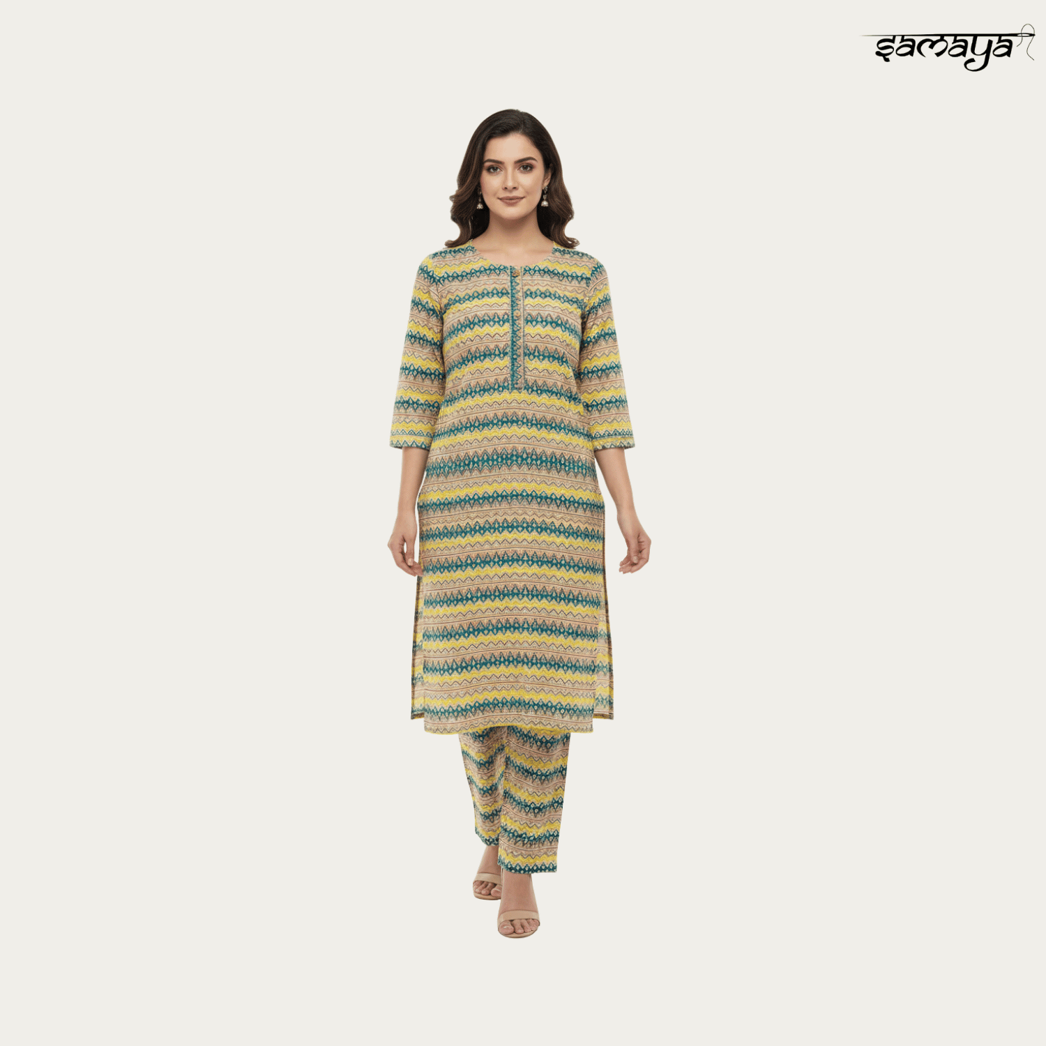 Beige Green Printed Cotton Kurti Set for Office & Festive Wear
