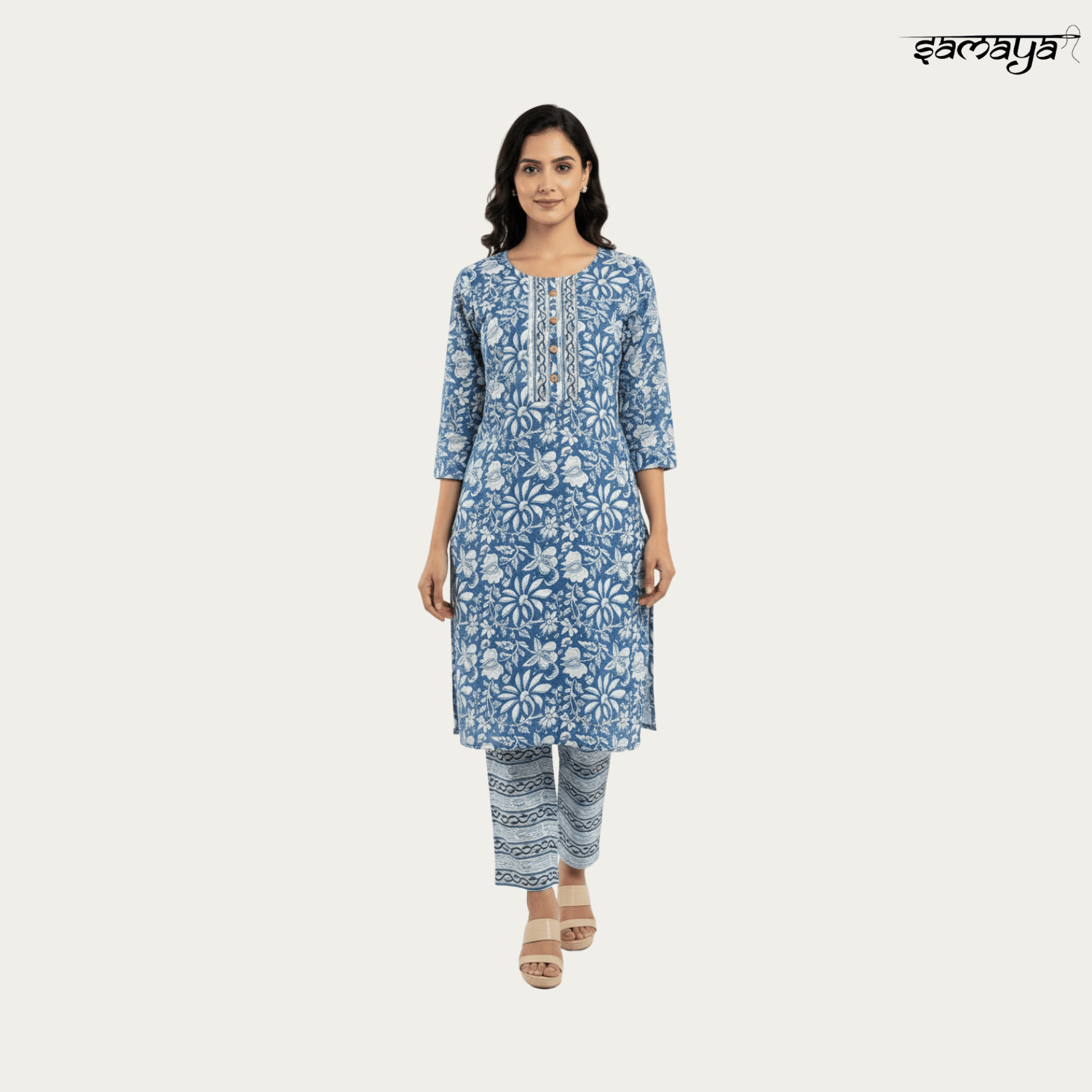 Blue Floral Printed Cotton Kurti Set Office Casual Wear