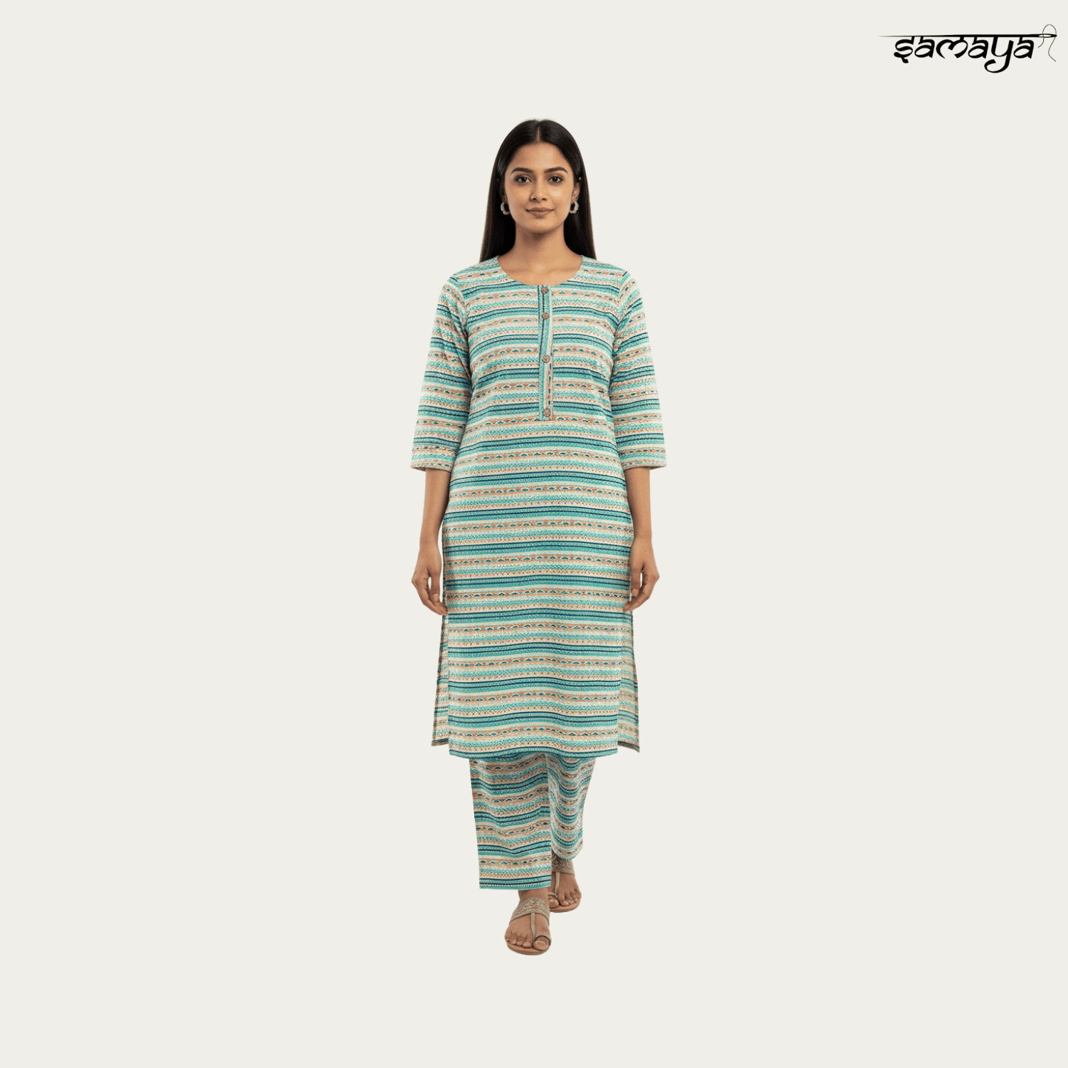 Aqua Green Printed Cotton Kurti Set Office Daily Wear