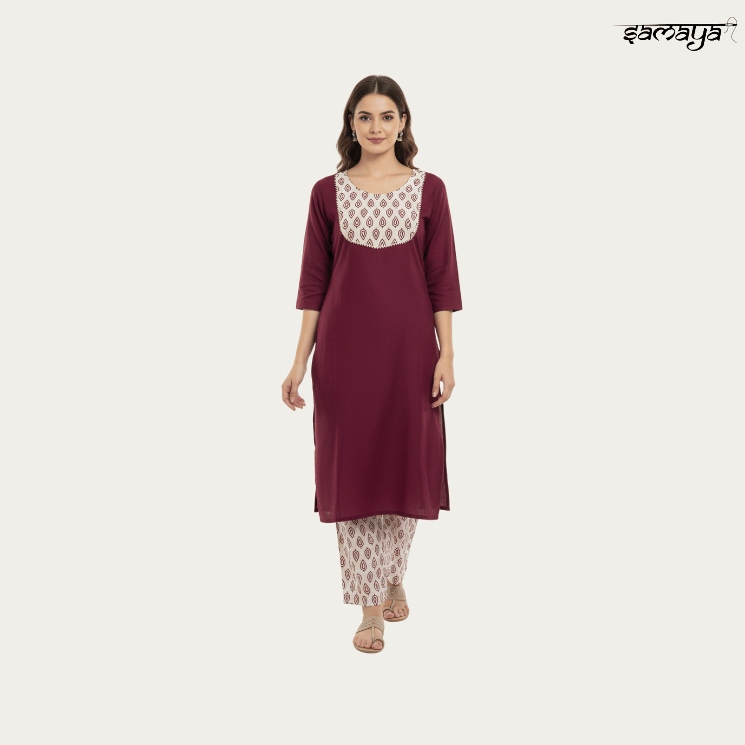 Wine Solid Cotton Kurti Set Printed Yoke Office Daily Wear