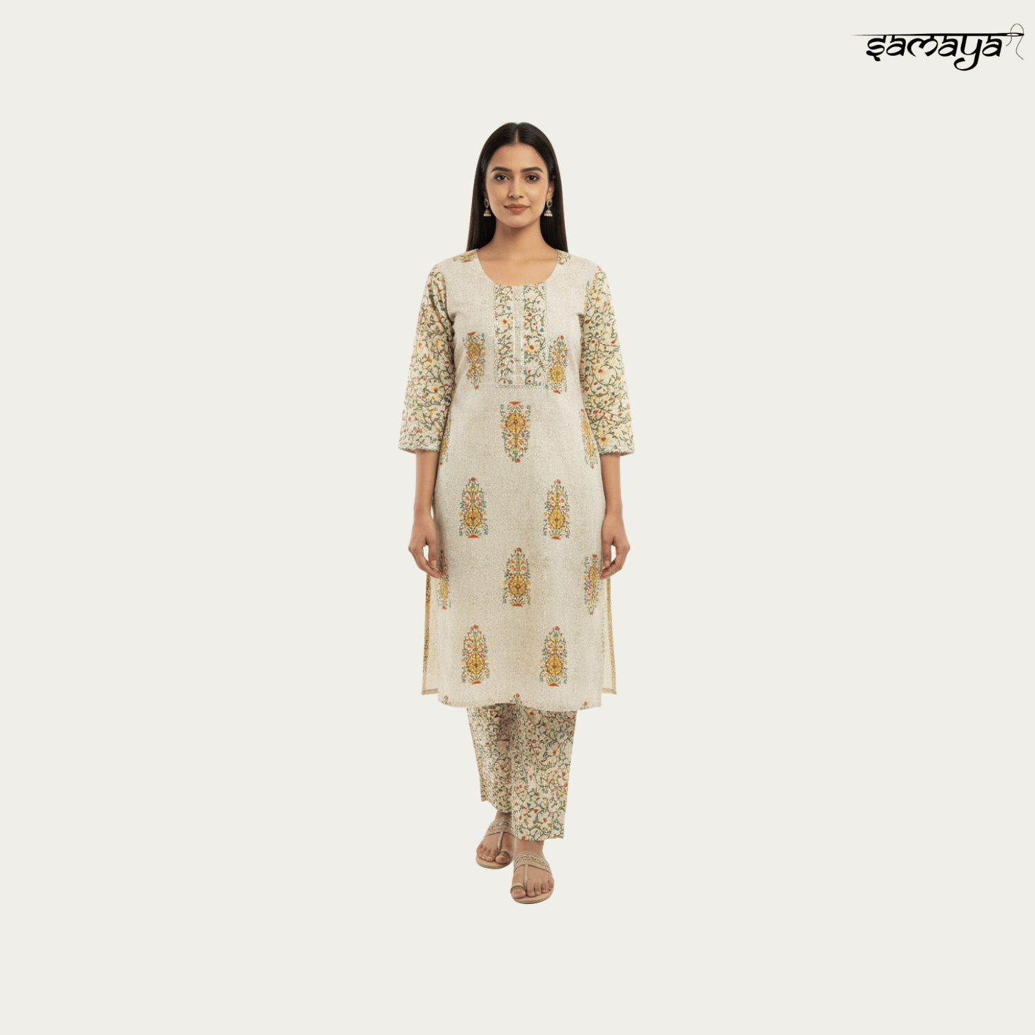 Cream Printed Cotton Kurti Set Ethnic Office Daily Wear