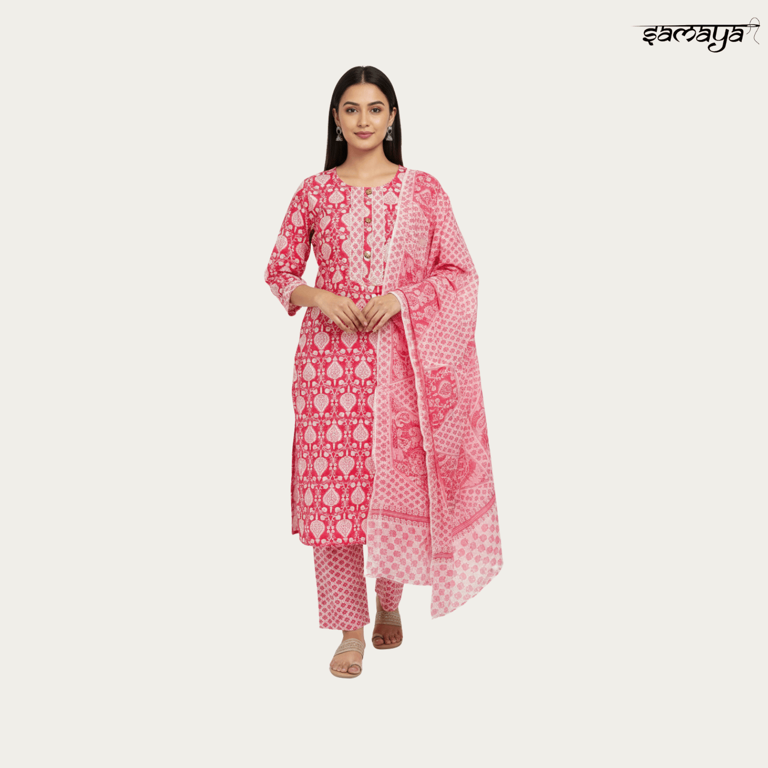 Rose Pink Printed Cotton Kurti Set with Dupatta Festive Wear