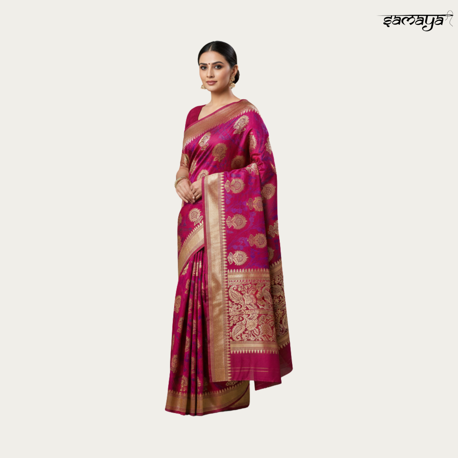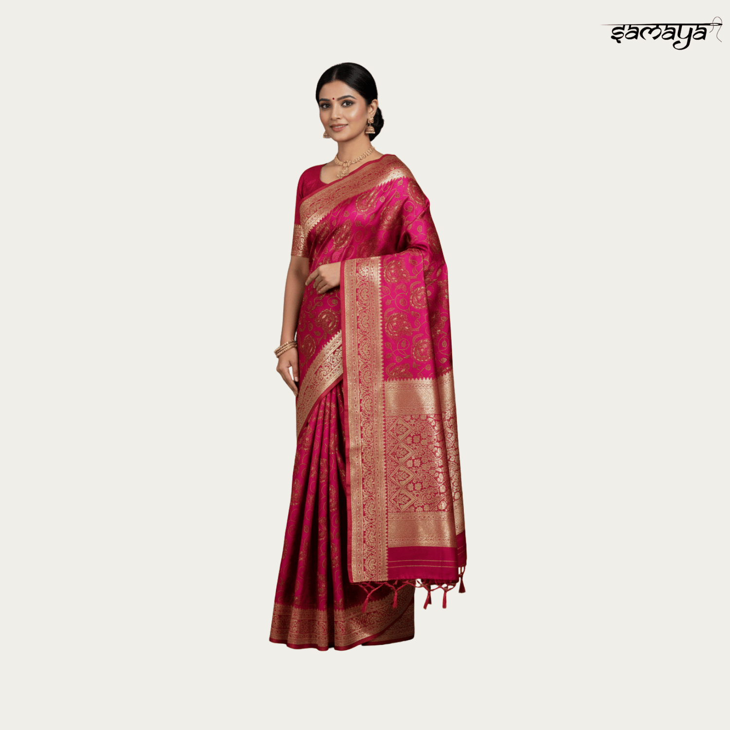 Magenta Pink Banarasi Silk Saree - Gold Zari Floral Vine Wedding Wear
