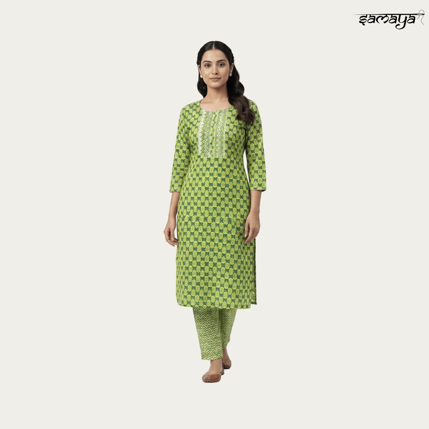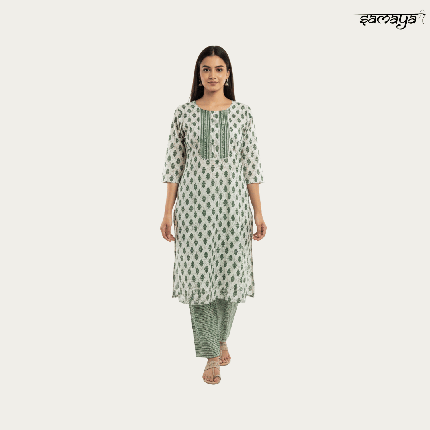 Beige Green Printed Cotton Kurti Set for Office & Festive Wear