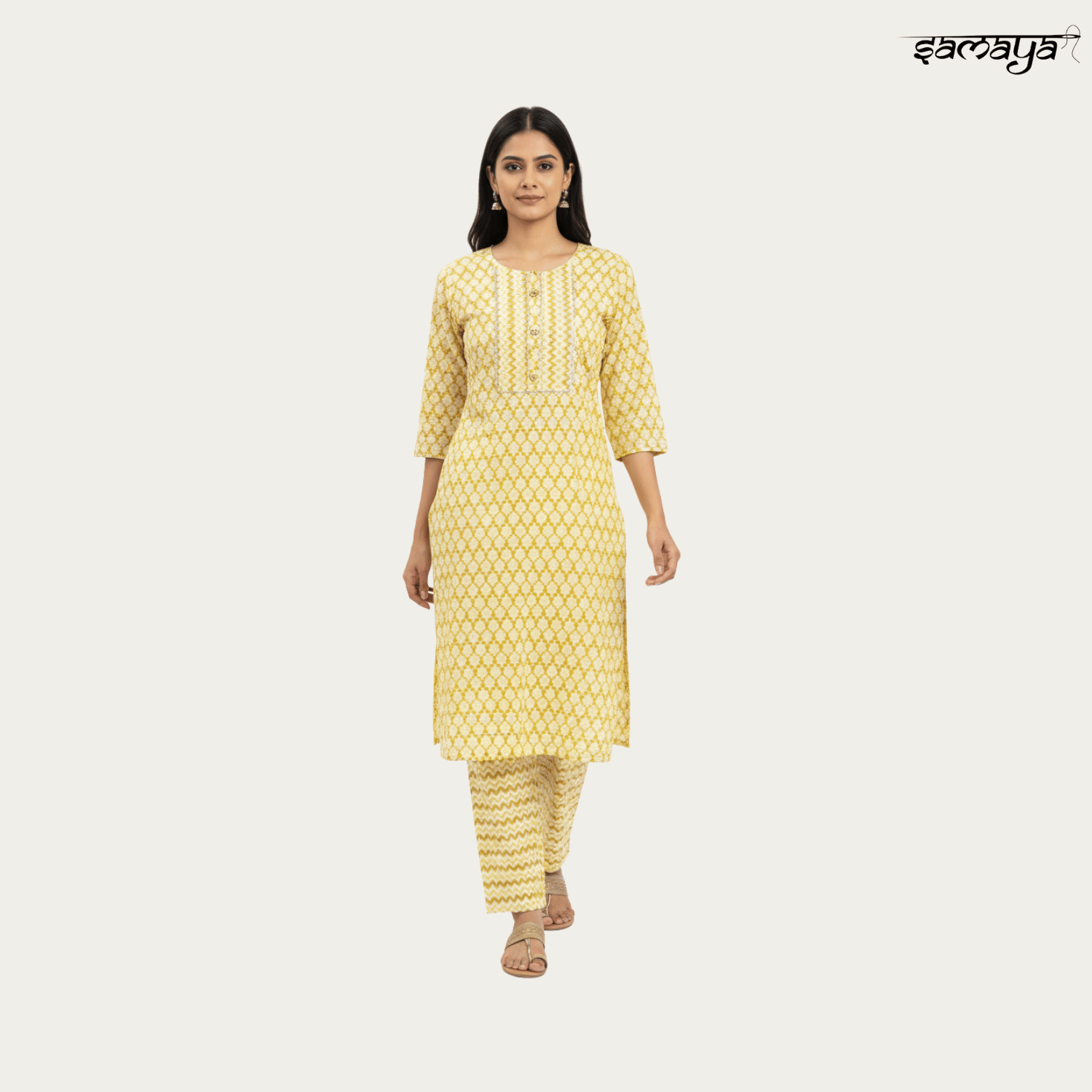 Cream Printed Cotton Kurti Set Ethnic Office Daily Wear