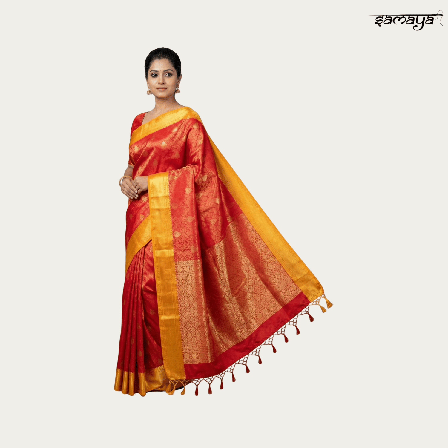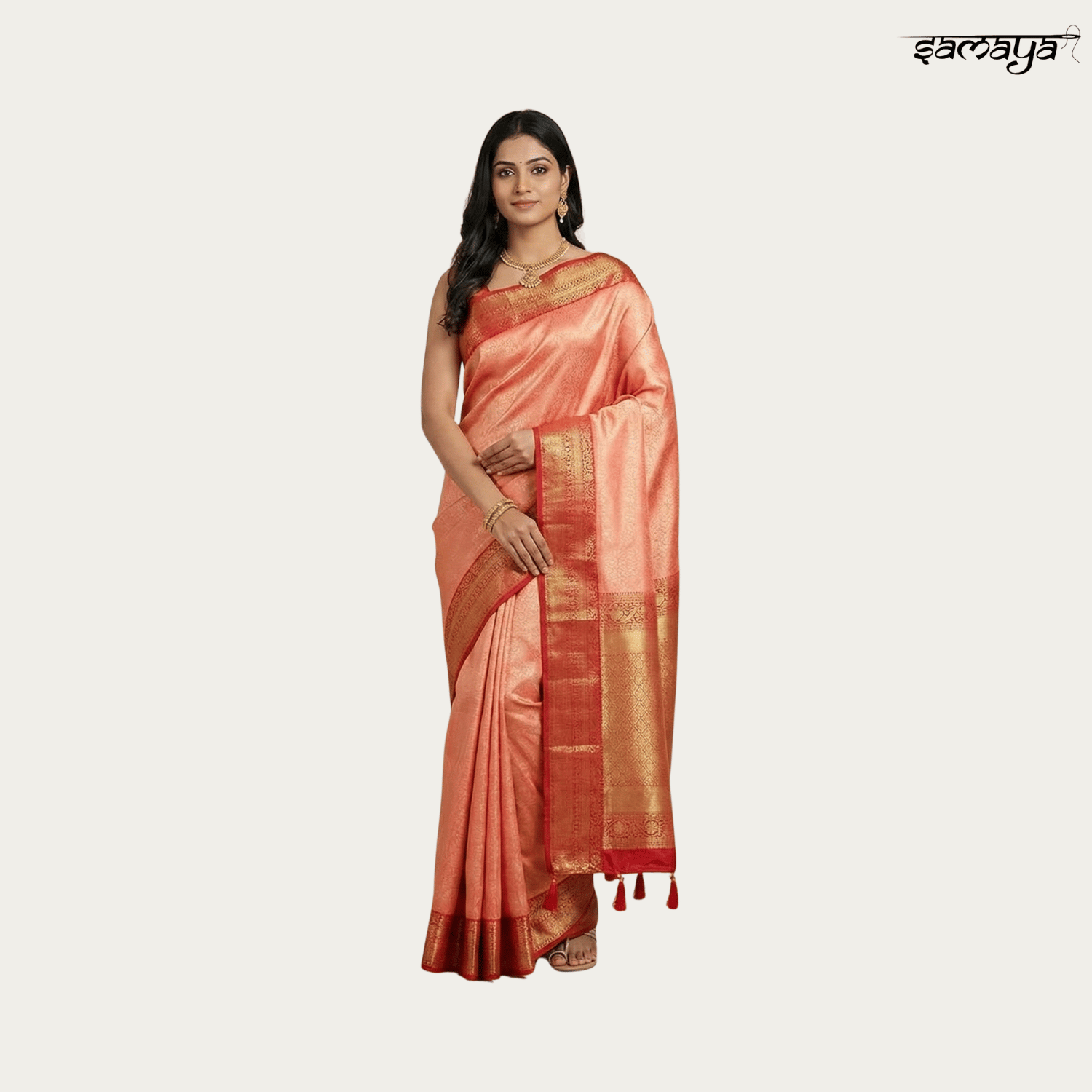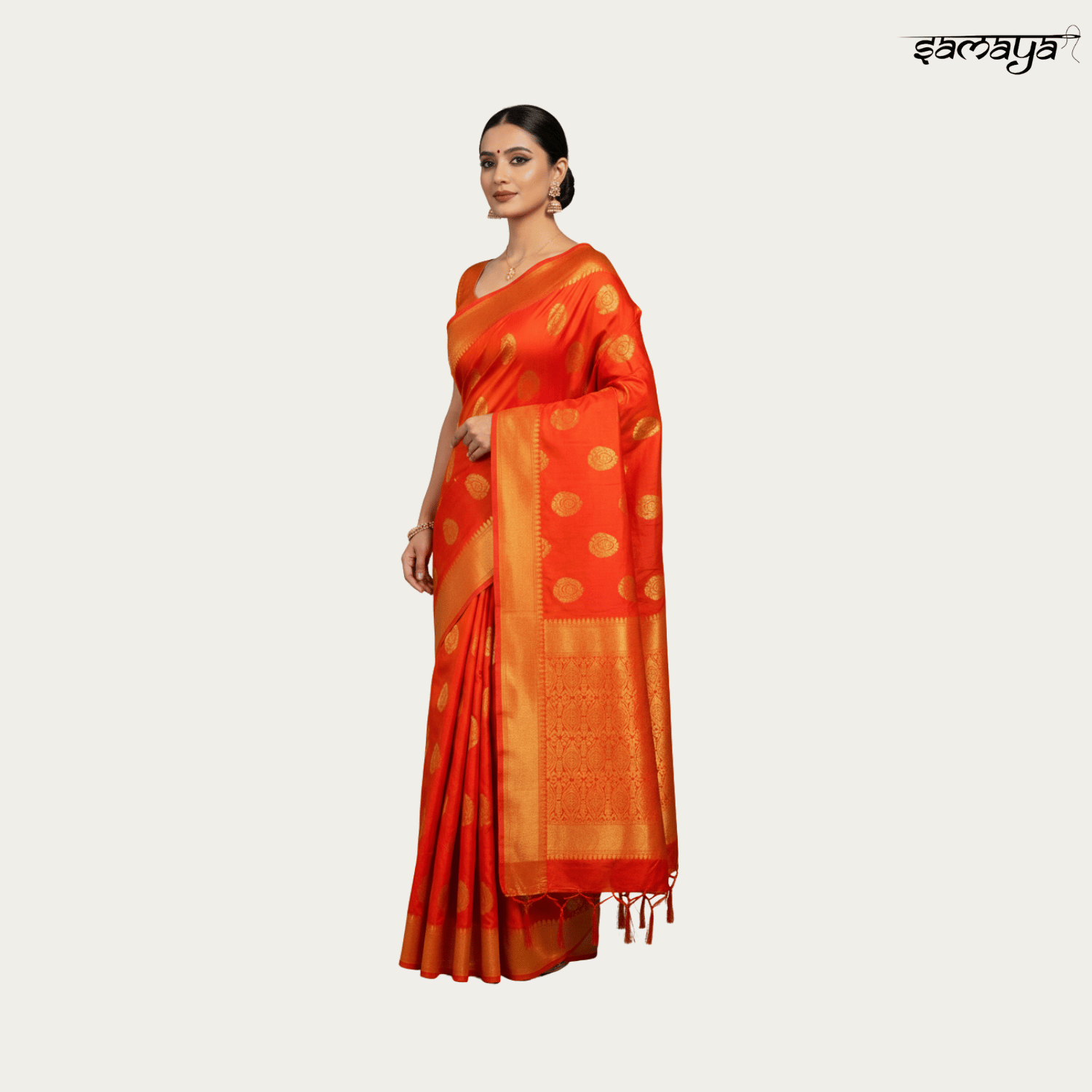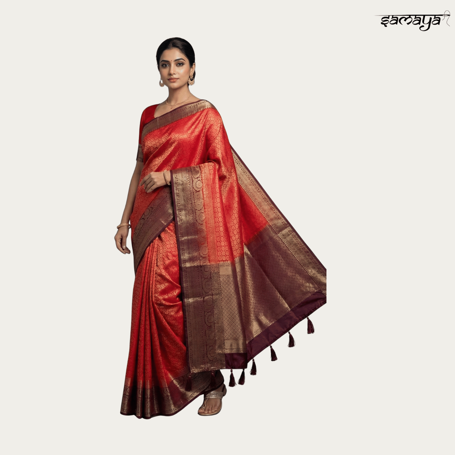 Wide contrasting red and orange border with intricate gold zari patterns inspired by Kanjivaram styles