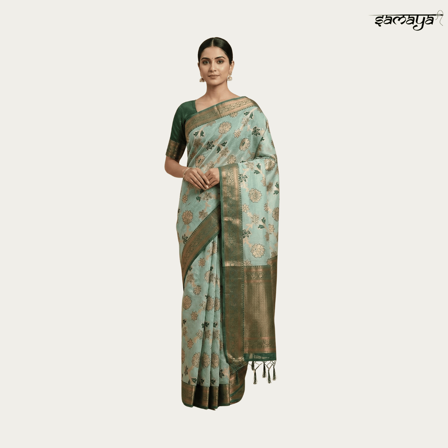 Sea Green Banarasi Soft Silk Saree with Gold Zari Floral Vines