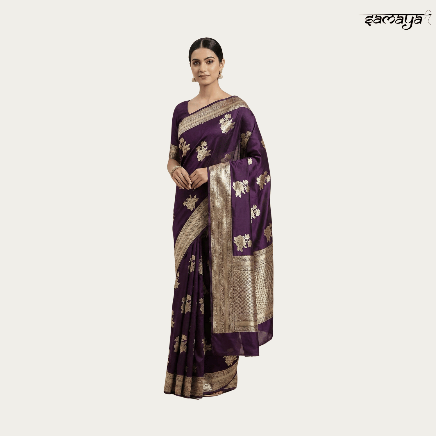 Deep Violet Soft Silk Saree with Silver Zari Floral Motifs