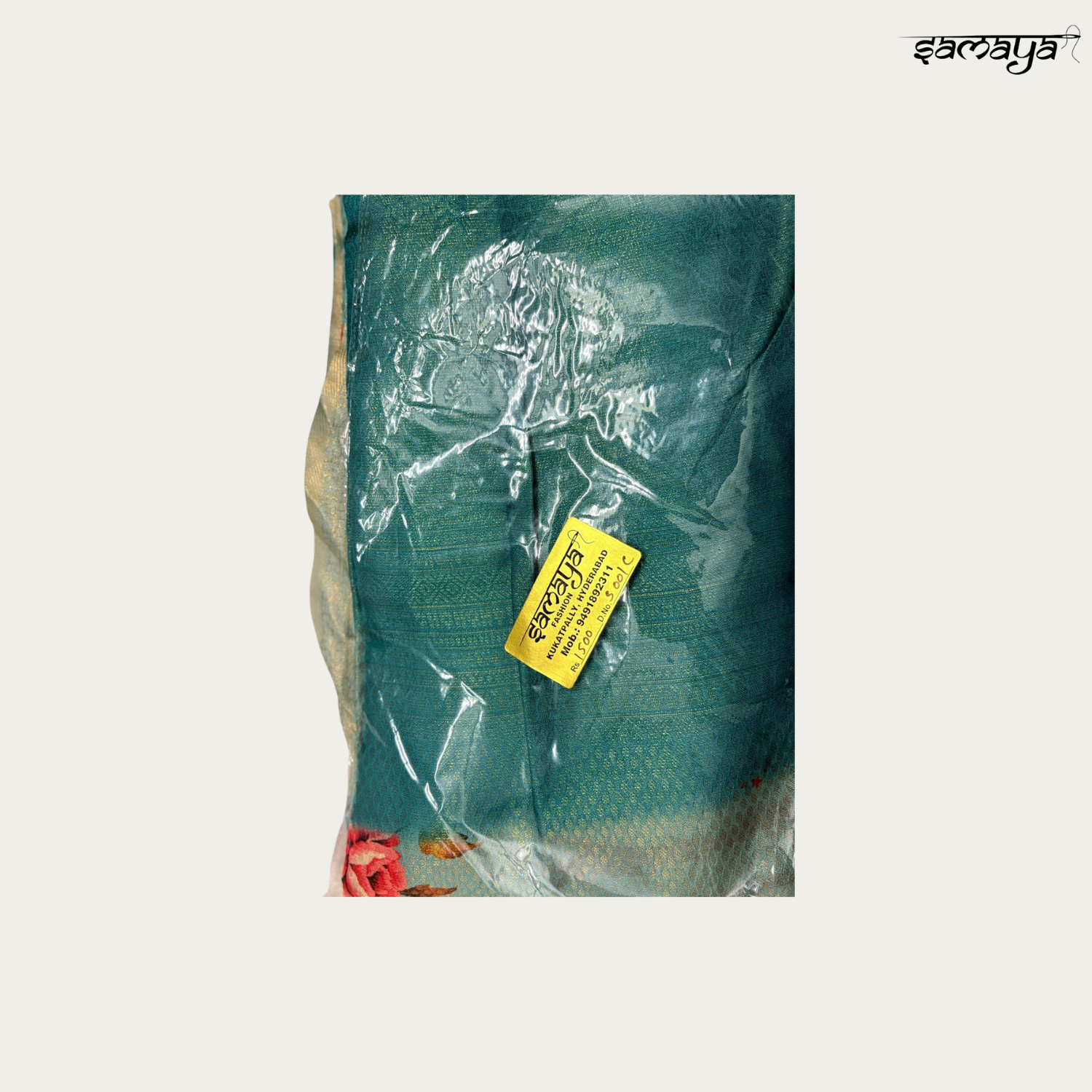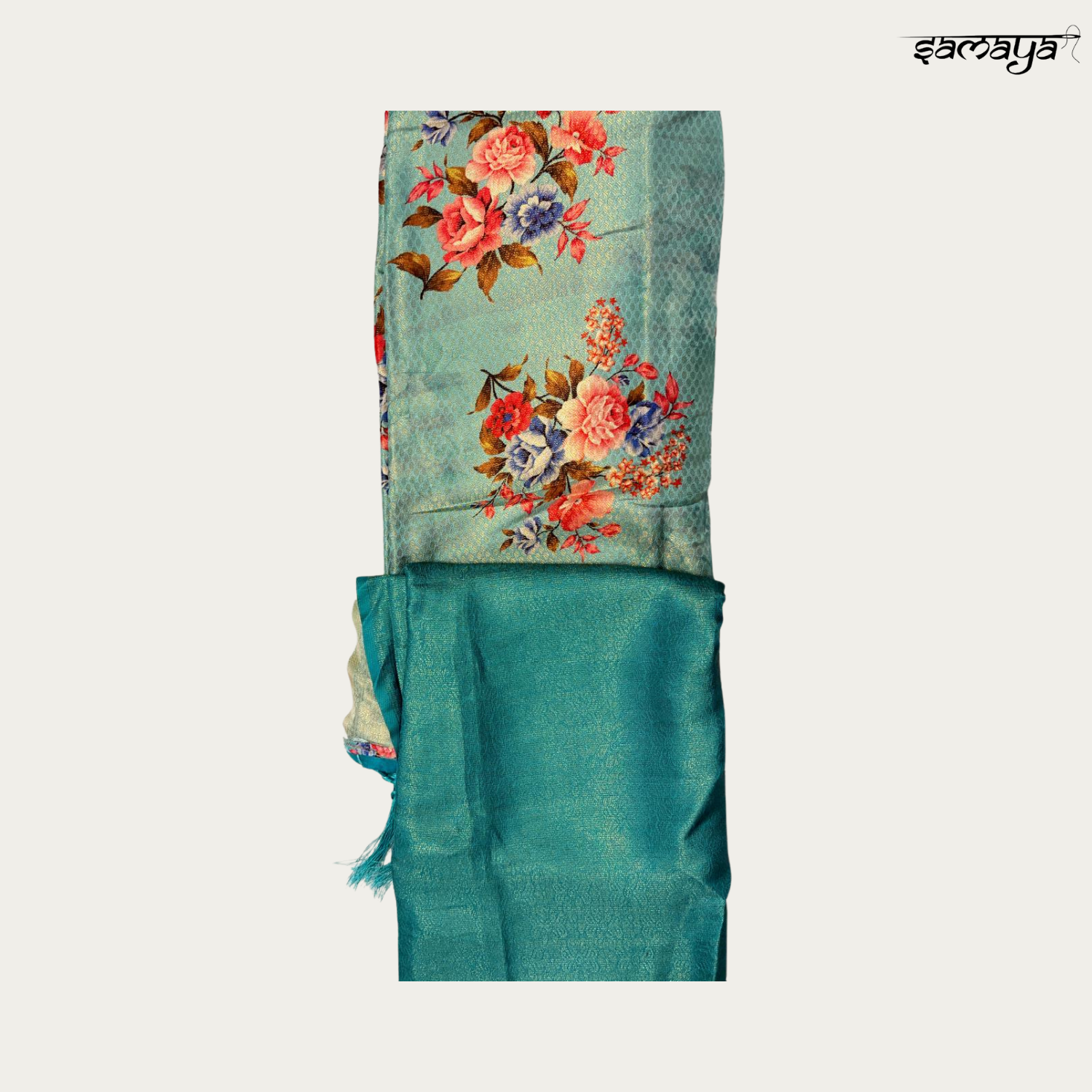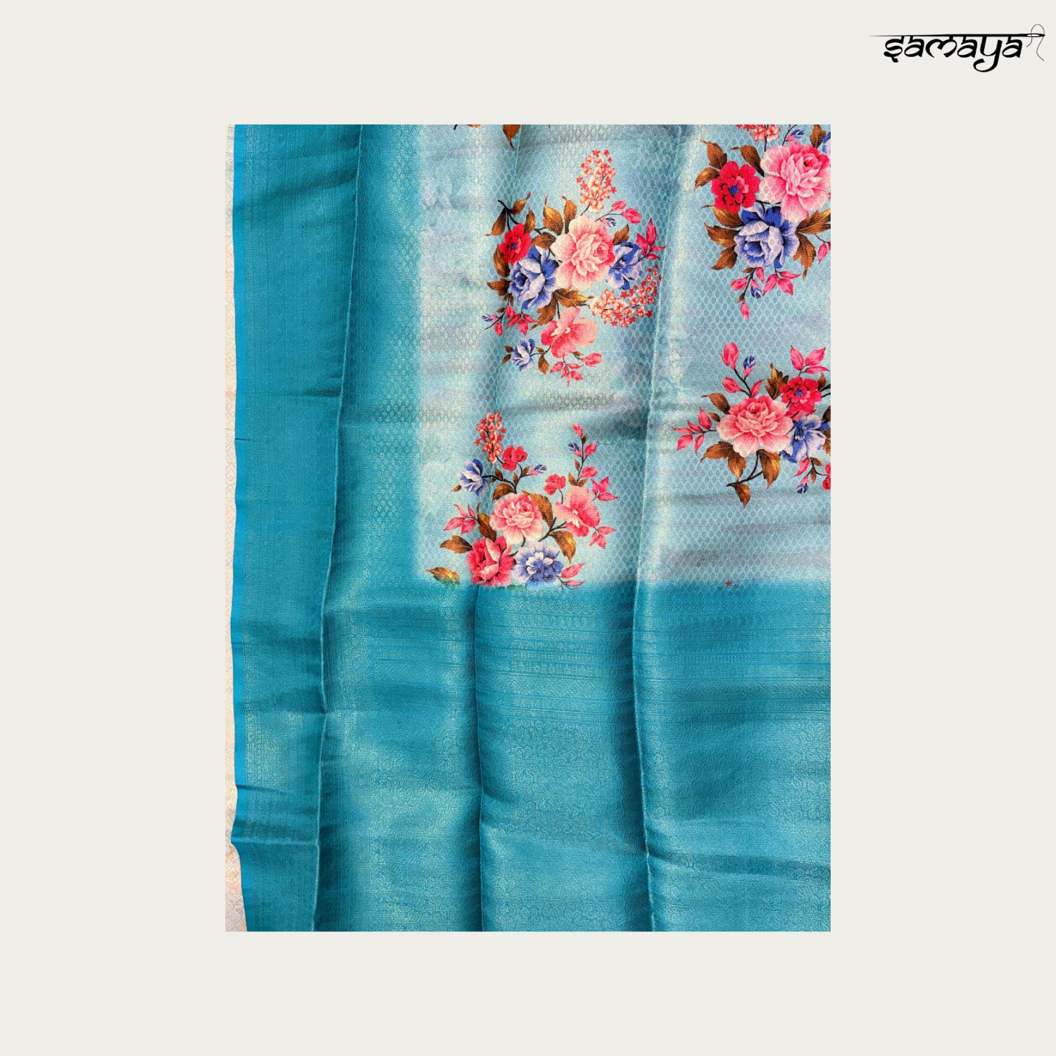 Aqua Blue Floral Silk Saree Teal Zari Border Party Festive