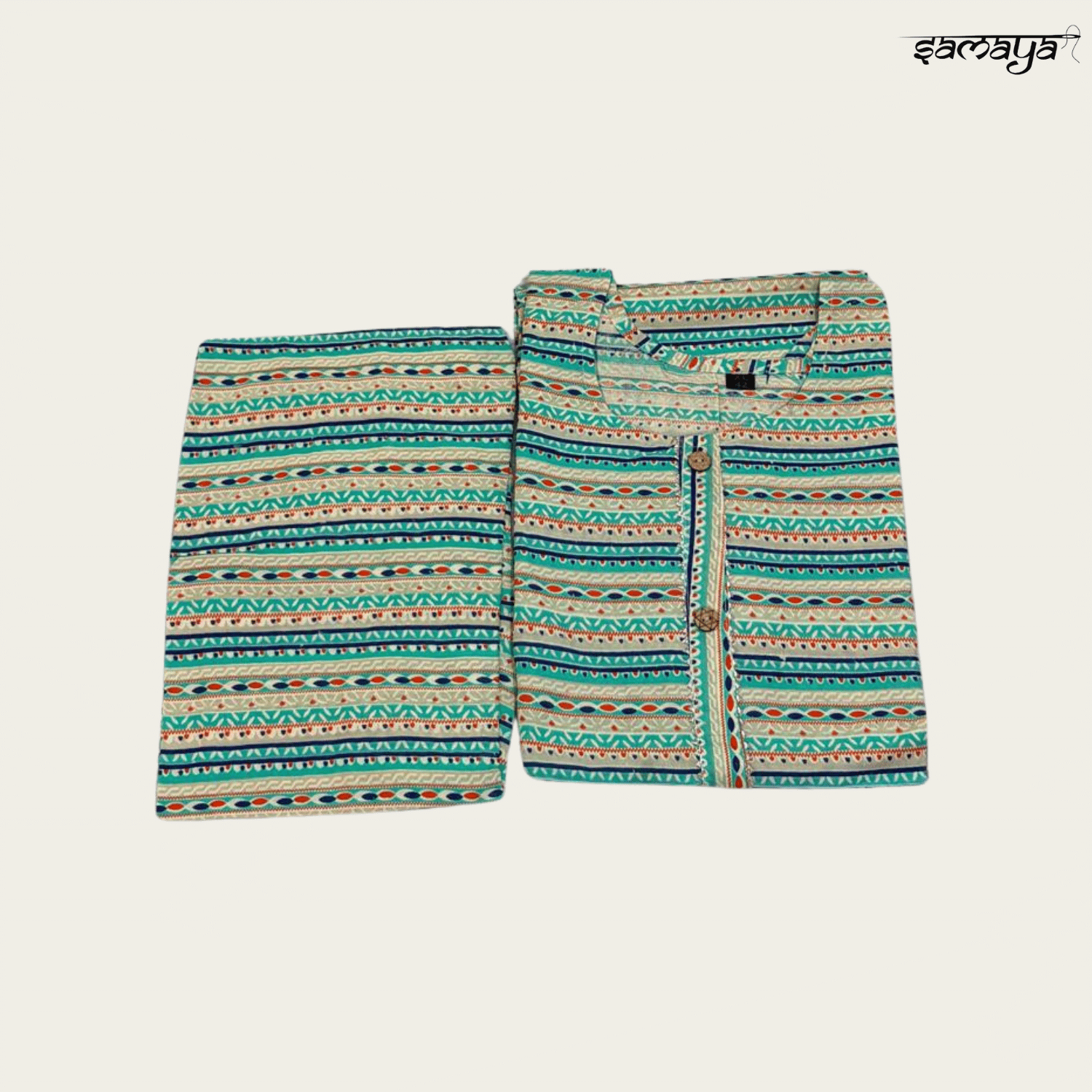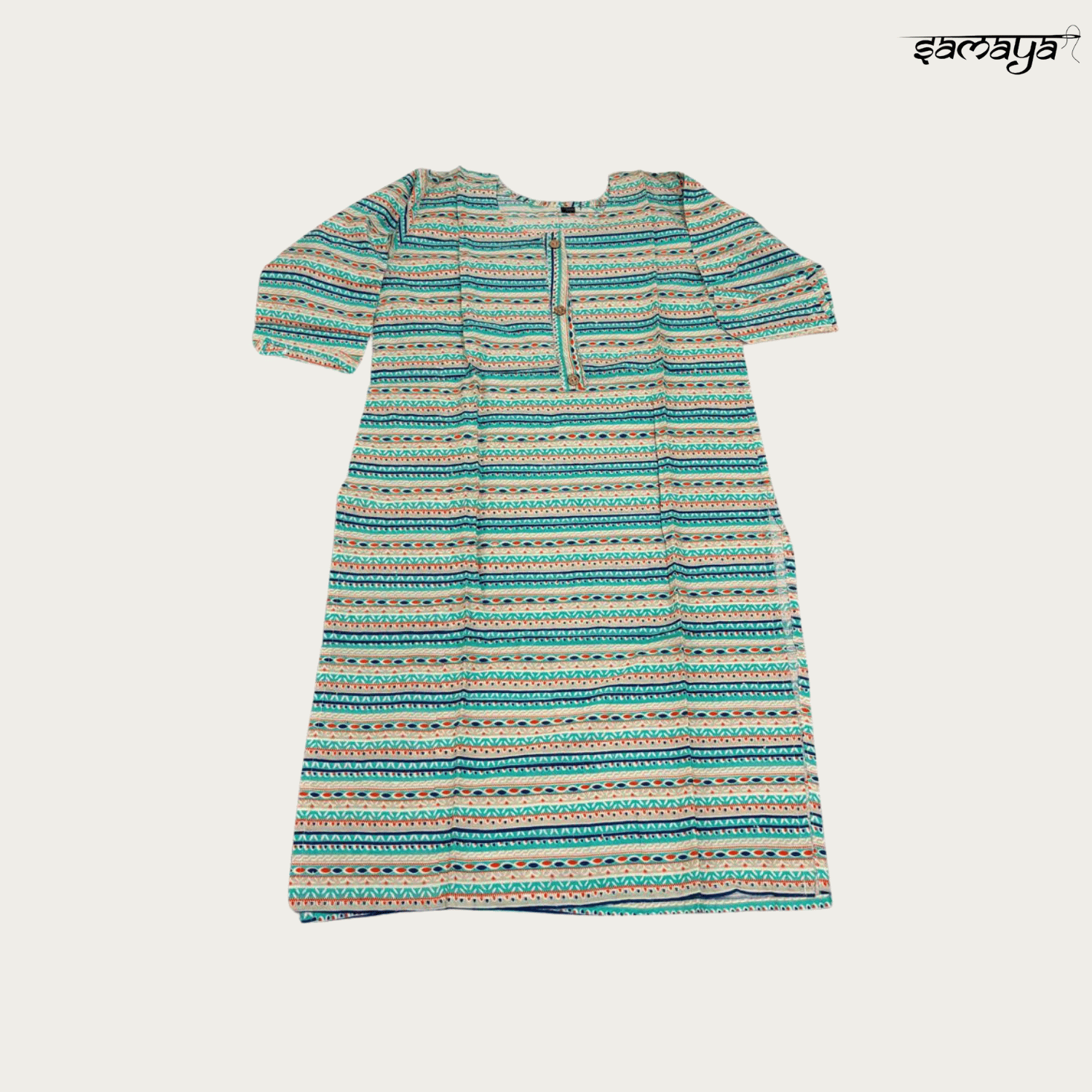 This aqua green printed cotton kurti set is crafted for women who prefer calm colors, breathable fabrics, and practical elegance in everyday ethnic wear. The refreshing aqua base with fine multicolor ethnic stripes gives a balanced, graceful appearance that works well across age groups. Designed for daily routines, office environments, and relaxed outings, this kurti set delivers comfort without compromising on style.