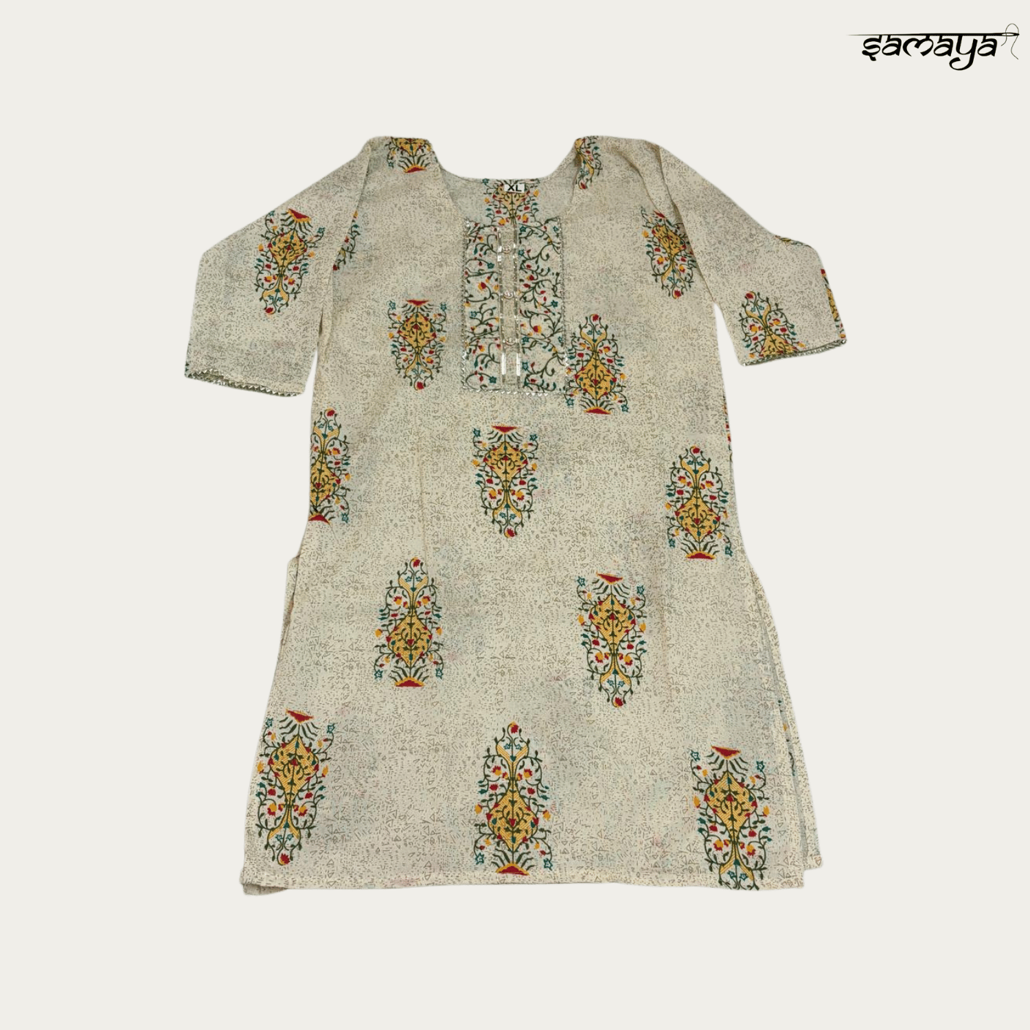 The kurti features traditional Indian-inspired motifs placed evenly across the body, creating a balanced and elegant appearance. The neckline is enhanced with contrast printed detailing that adds visual interest while keeping the design understated and contemporary.