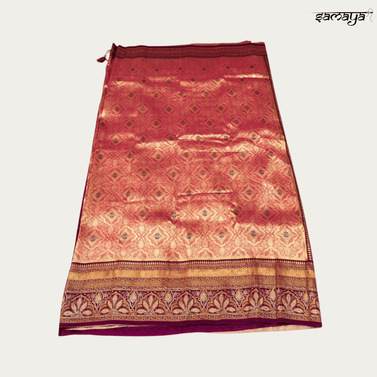 This pink Banarasi silk saree from Samaya Fashion is a luxurious choice for women who want to stand out at weddings and grand celebrations. The rich pink base with heavy golden zari weaving creates a royal, camera-friendly look suitable for brides, bridesmaids, and wedding guests alike. Ideal as a bridal saree, reception saree, or festive saree, it flatters all age groups and complements traditional as well as contemporary jewelry styling.