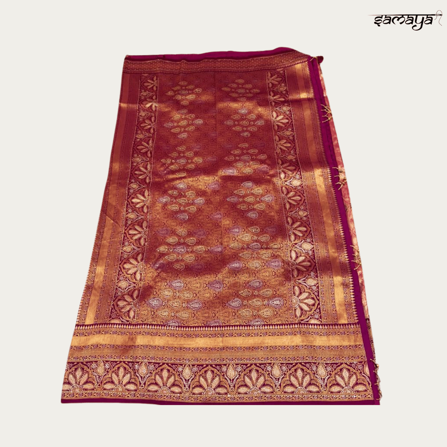 Deep Maroon Banarasi Soft Silk Saree with Gold Zari Floral Buttas