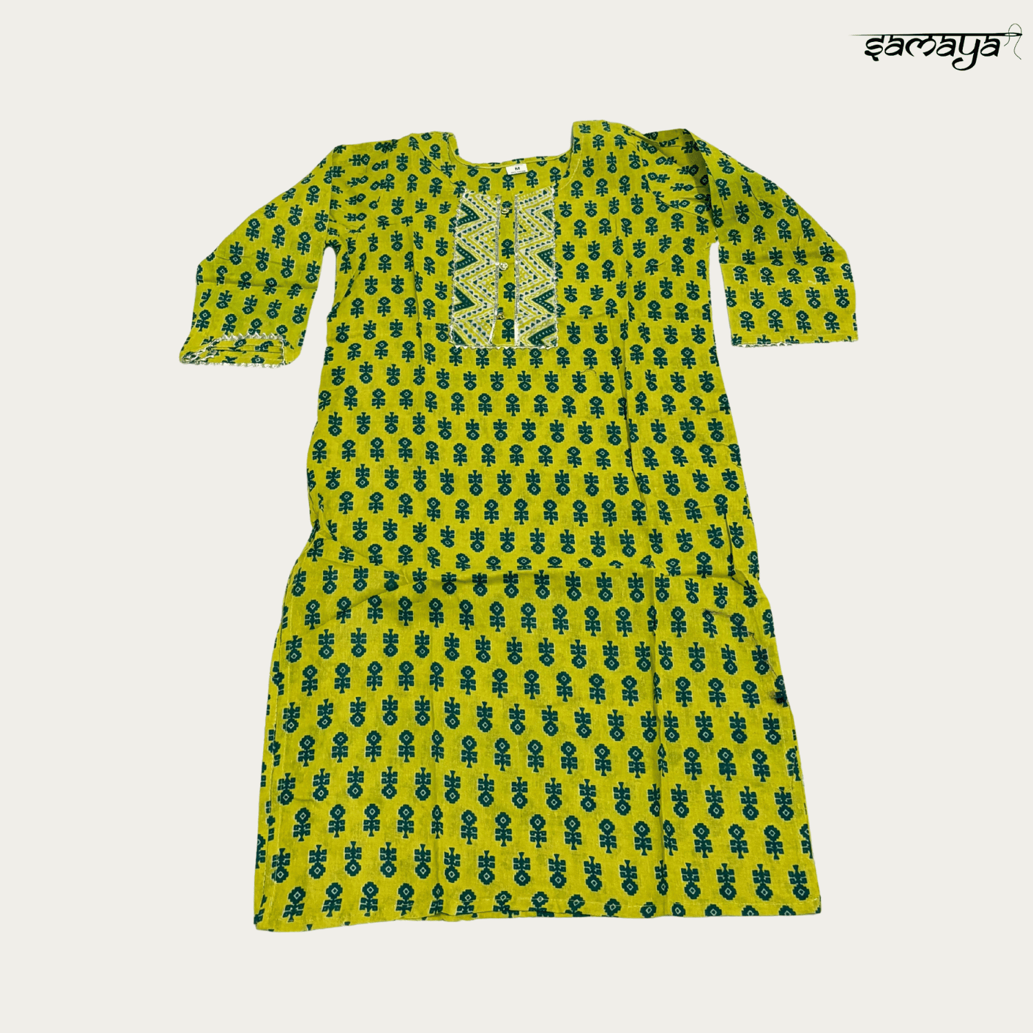 Yellow Cotton Printed Embroidered Kurti Set for Festive Wear