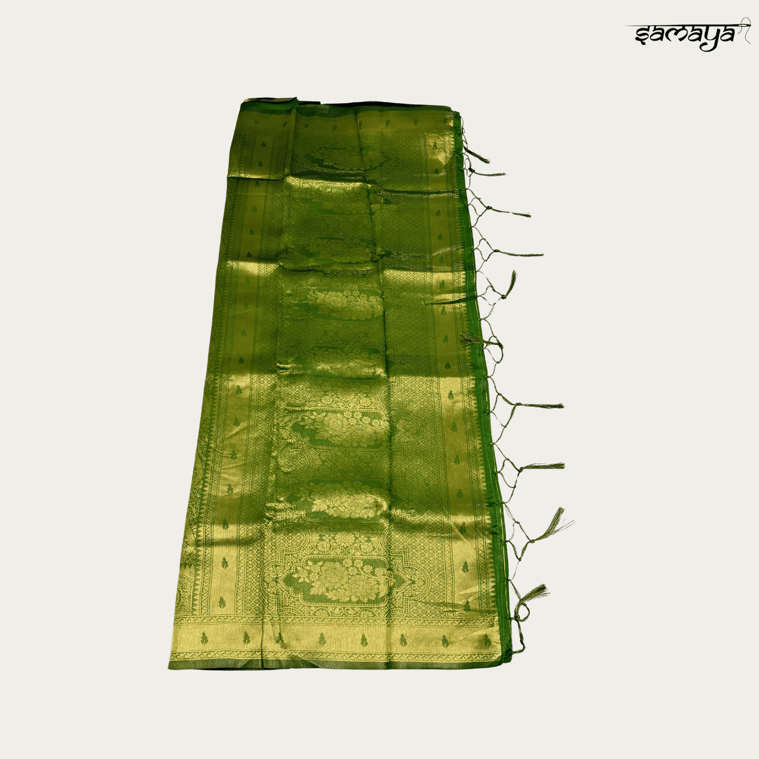 The saree features an all-over floral and paisley zari motif that exudes royal charm, complemented by a broad border woven with traditional patterns. The grand pallu showcases elaborate craftsmanship that catches the eye, creating a magnificent contrast against the vibrant green base.