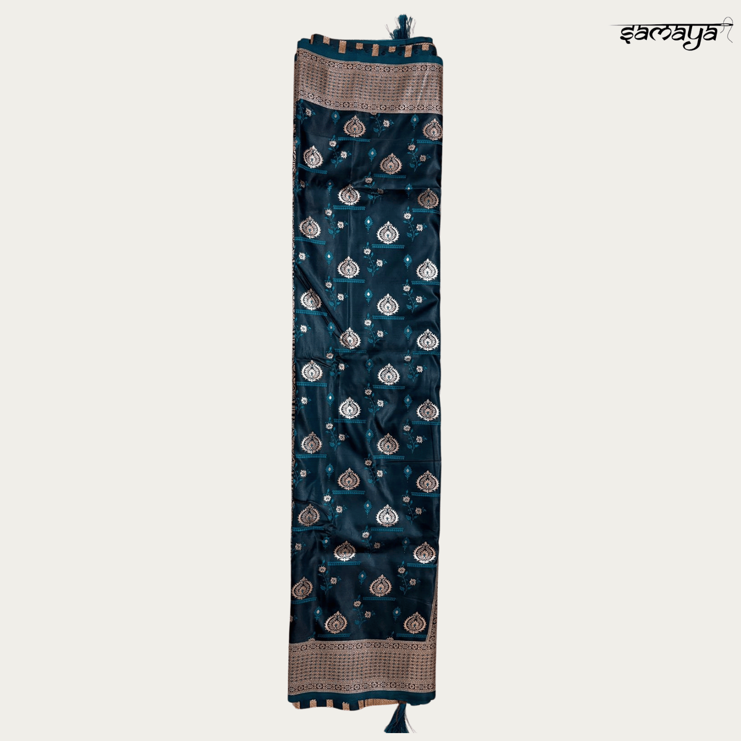 Woven from premium soft silk, this saree offers a rich and lustrous drape without being heavy. The fabric feels gentle against the skin and allows for excellent breathability, keeping you comfortable during long events. Its deep teal hue reflects light beautifully, adding a subtle glow to your appearance.