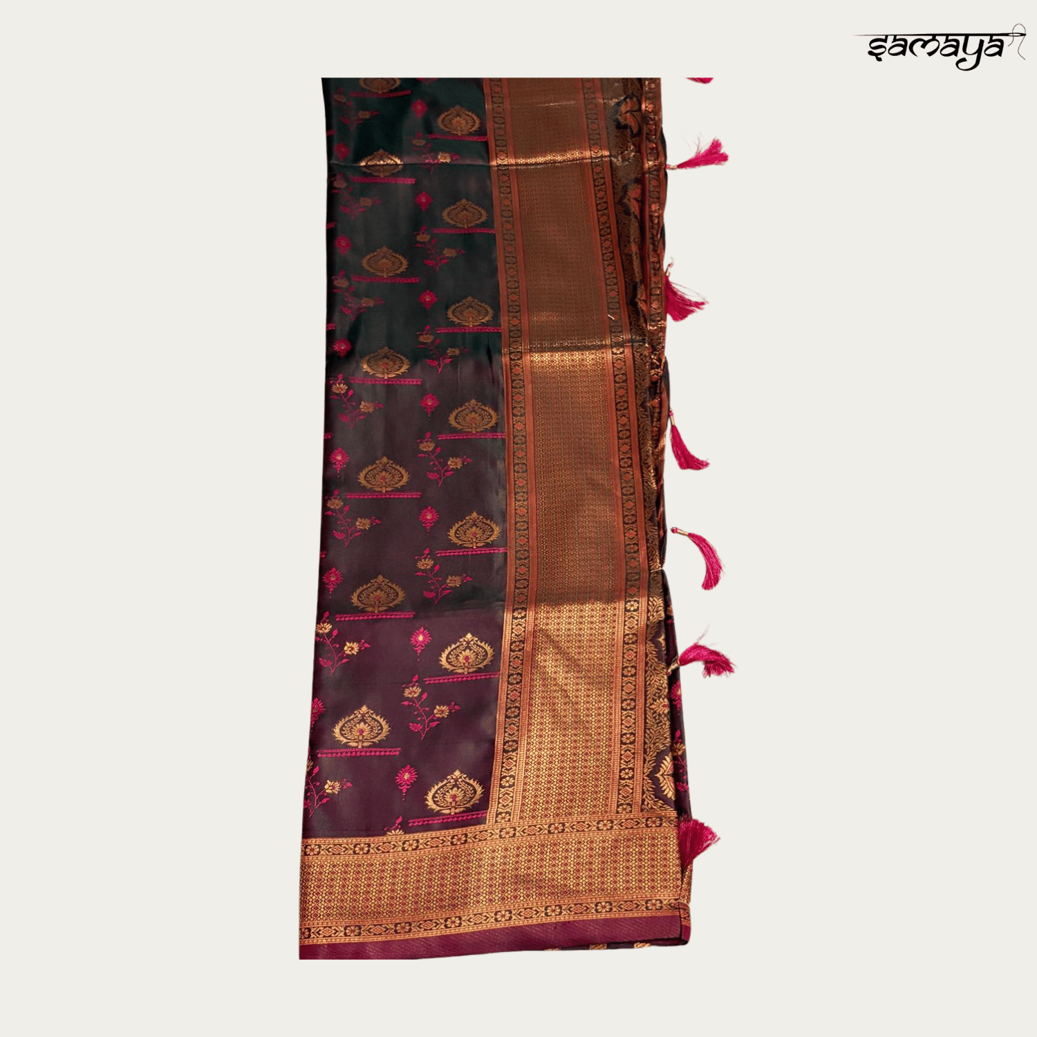 Exude modern elegance with this chic Black Soft Silk Saree from Samaya Fashion, beautifully accented with vibrant pink zari motifs. This unique combination is a standout choice for women who love to experiment with contemporary ethnic wear. Ideal for evening parties, festive gatherings, and social events, this saree offers a bold and stylish look that suits women of all ages.
