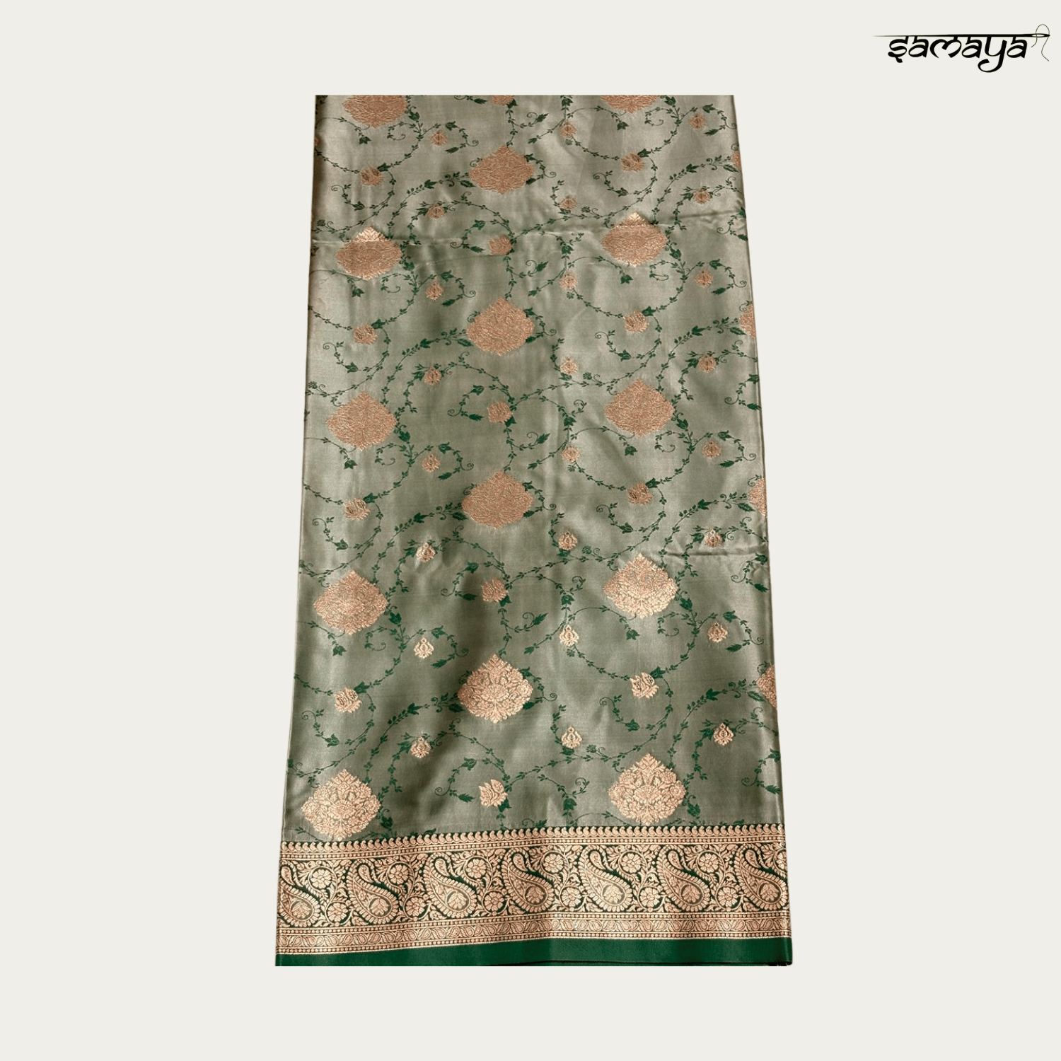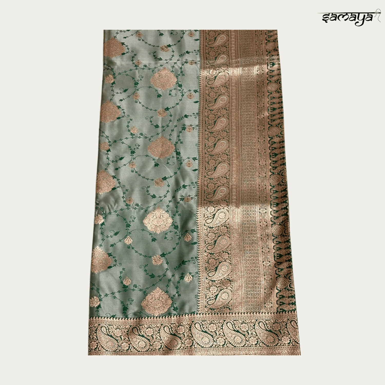 Pista Green Banarasi Soft Silk Saree with Gold Zari Floral Jaal