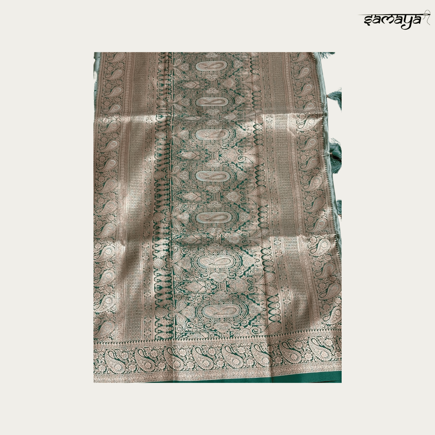 Bottle Green Soft Banarasi Silk Saree with Silver Zari for Festive Wear