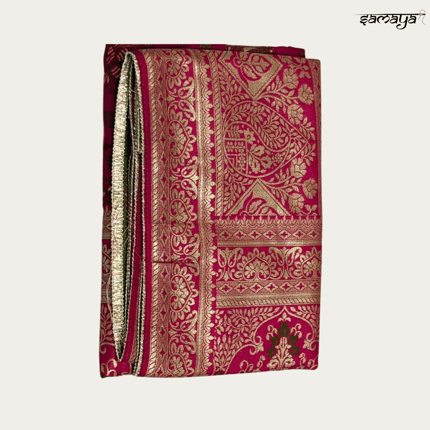 Embrace timeless royalty with this enchanting Magenta Pink Banarasi silk saree from Samaya Fashion. Featuring intricate gold zari floral vine motifs, this Rani Pink drape is a masterpiece of traditional weaving, perfect for brides, weddings, and festive celebrations where you want to make a regal statement.