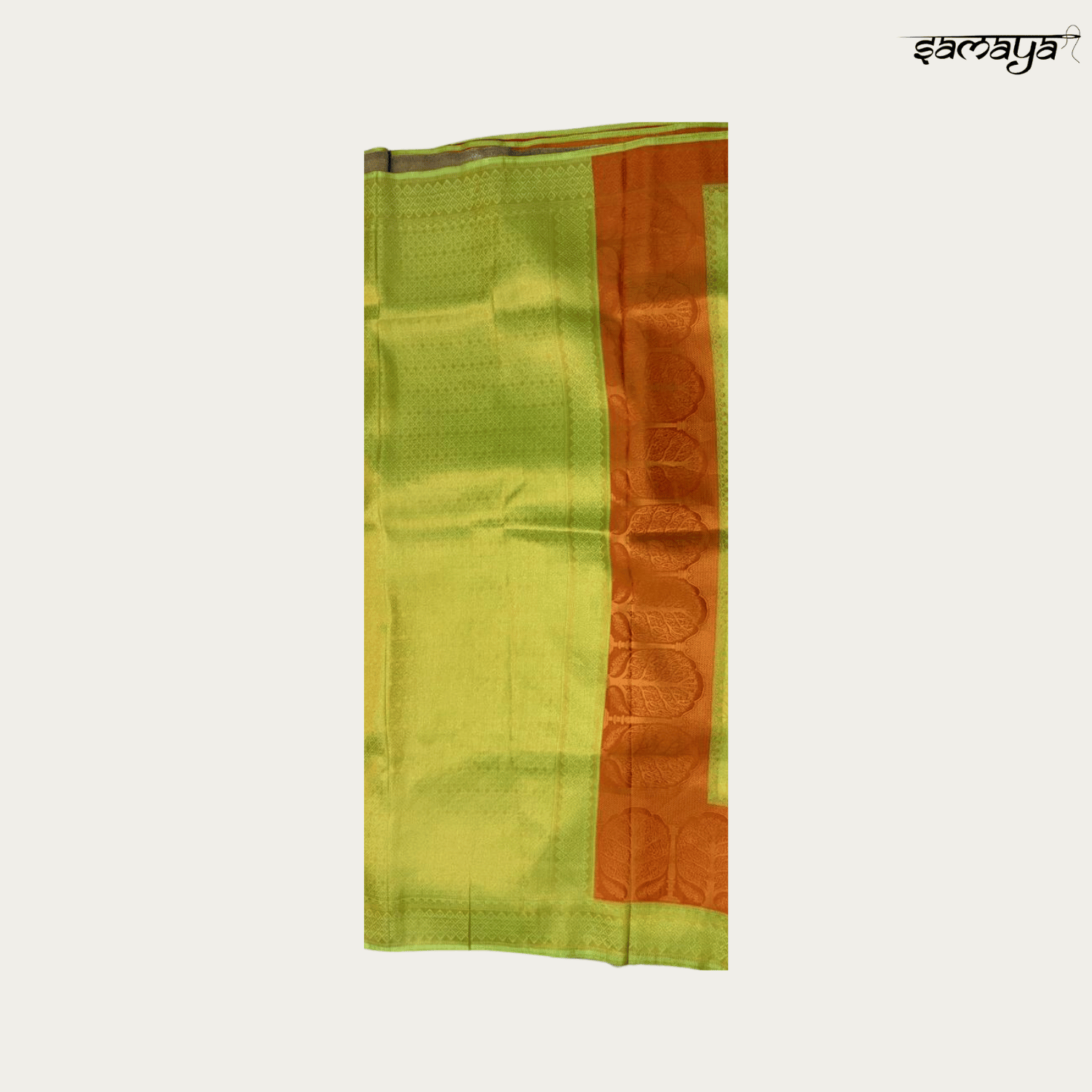 The saree features delicate leaf-like self-motifs scattered across the lime green body, creating a textured look. The broad orange border is intricately woven with traditional temple and floral designs in gold zari, adding a classic touch to the modern color mix.
