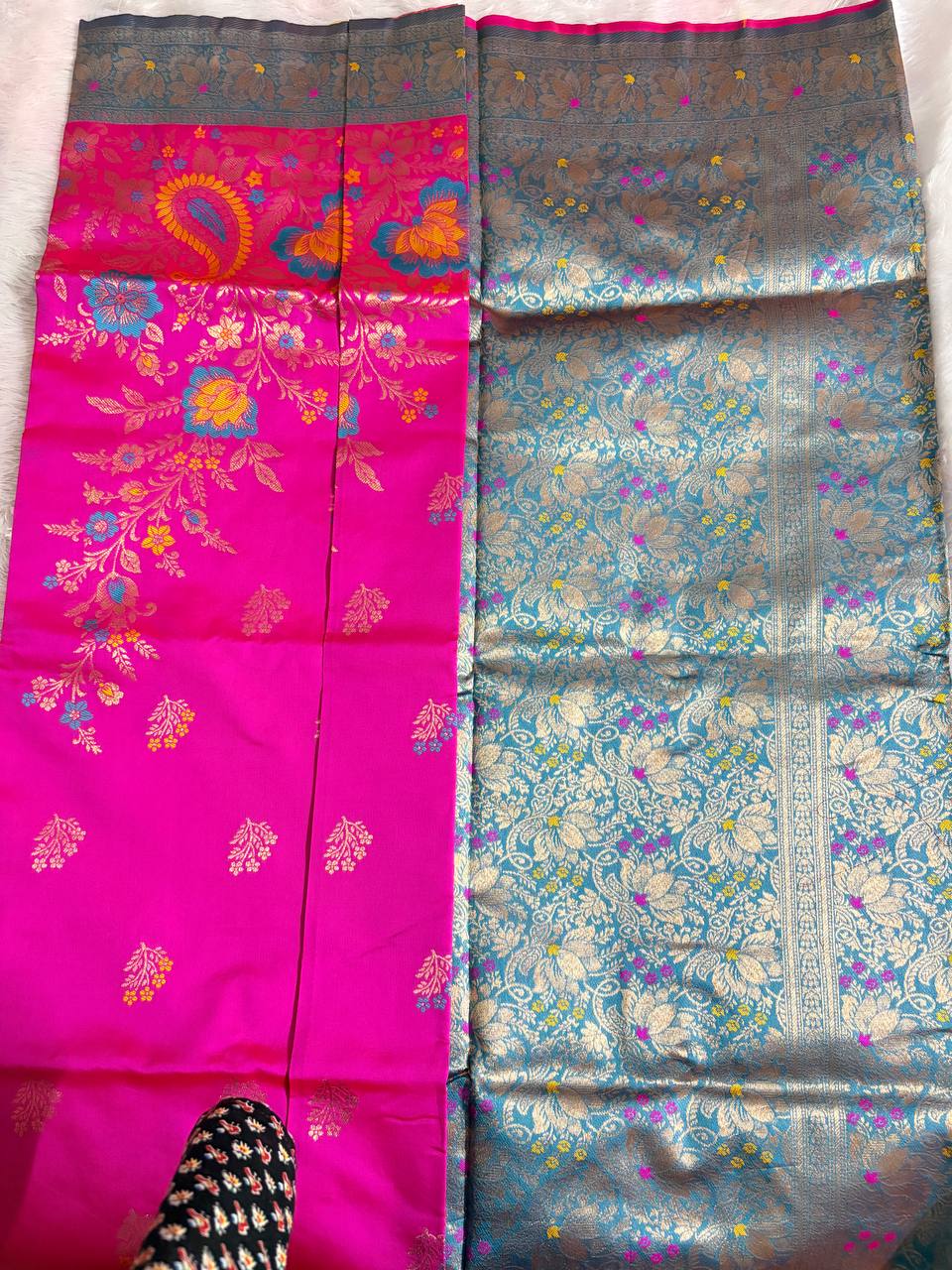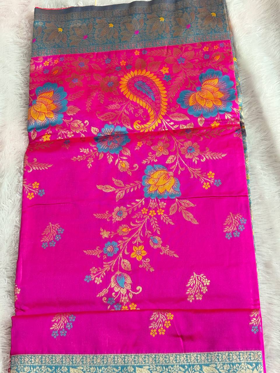 This pink soft silk banarasi saree is crafted for women who want a rich festive wear saree that stands out effortlessly at weddings, receptions, and traditional celebrations. The saree features a vibrant pink body paired with an intricate contrast zari woven pallu in a blue tone, creating a luxurious visual balance that aligns with popular buyer searches for banarasi saree online and budget saree options that still deliver premium appeal. Its floral motifs, paisley detailing, and shimmering zari threads showcase classic craftsmanship inspired by traditional loom artistry while keeping the drape lightweight for long hours of comfort. Soft silk sarees are known for their smooth texture and easy fall, and this piece follows the same legacy. The fabric offers a gentle sheen, making it perfect as a wedding saree or party wear saree without feeling heavy. Shoppers looking for a saree under 2000 or festive wear saree with superior finishing often prefer designs like this because they combine cultural elegance with affordability. The pallu features dense brocade style weaving, giving it a statement look ideal for reception entries, haldi functions, or festive puja ceremonies. The drape forms clean pleats with minimal effort, making it suitable for both first time saree wearers and experienced saree enthusiasts. This makes it a useful choice for women searching for lightweight saree options for long events. The contrast blouse fabric enhances overall styling versatility, allowing pairing with gold jewellery, oxidised accessories, or contemporary party wear styling depending on the occasion. Culturally, banarasi weaving remains one of the most loved saree traditions in India, and this design continues that heritage in a modern palette. Customers from Kukatpally Hyderabad saree shopping hubs often look for bright colors and elegant floral zari work, making this design highly relevant for local buyer intent. The saree also fits Google Shopping style queries such as soft silk saree for wedding, banarasi saree online shopping, and festive wear saree affordable range. Order processing is quick, with delivery typically completed within a few working days depending on location. Cash on delivery is available for convenience, and returns are accepted within the standard policy timeline if the product is unused and in original condition. For support or order related assistance, customers can reach out to the SamayaFashion team anytime. Every saree is quality checked before dispatch, ensuring buyers receive a reliable and trustworthy experience with each purchase.