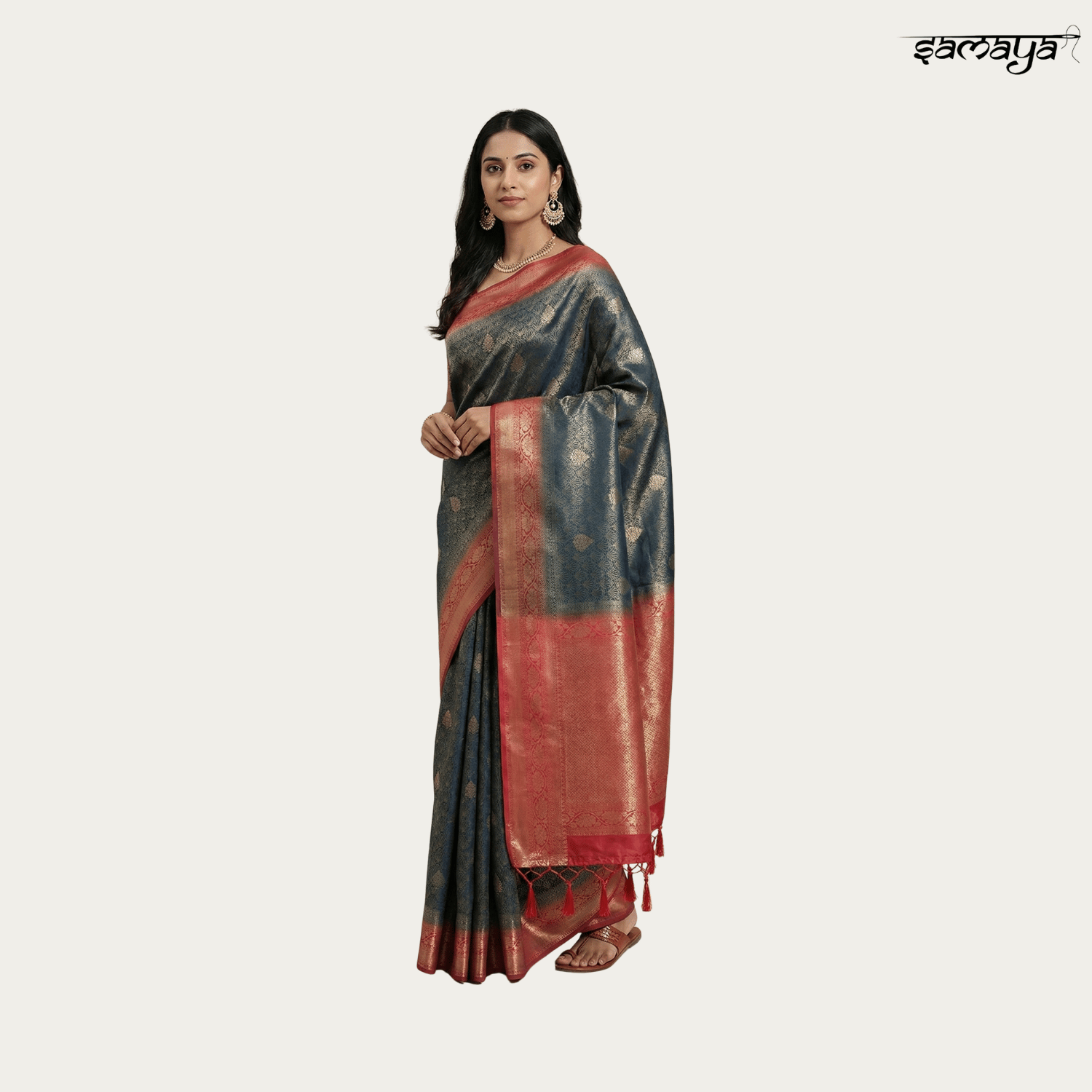Deep Teal Blue Banarasi Silk Saree with Red Border Party Wear