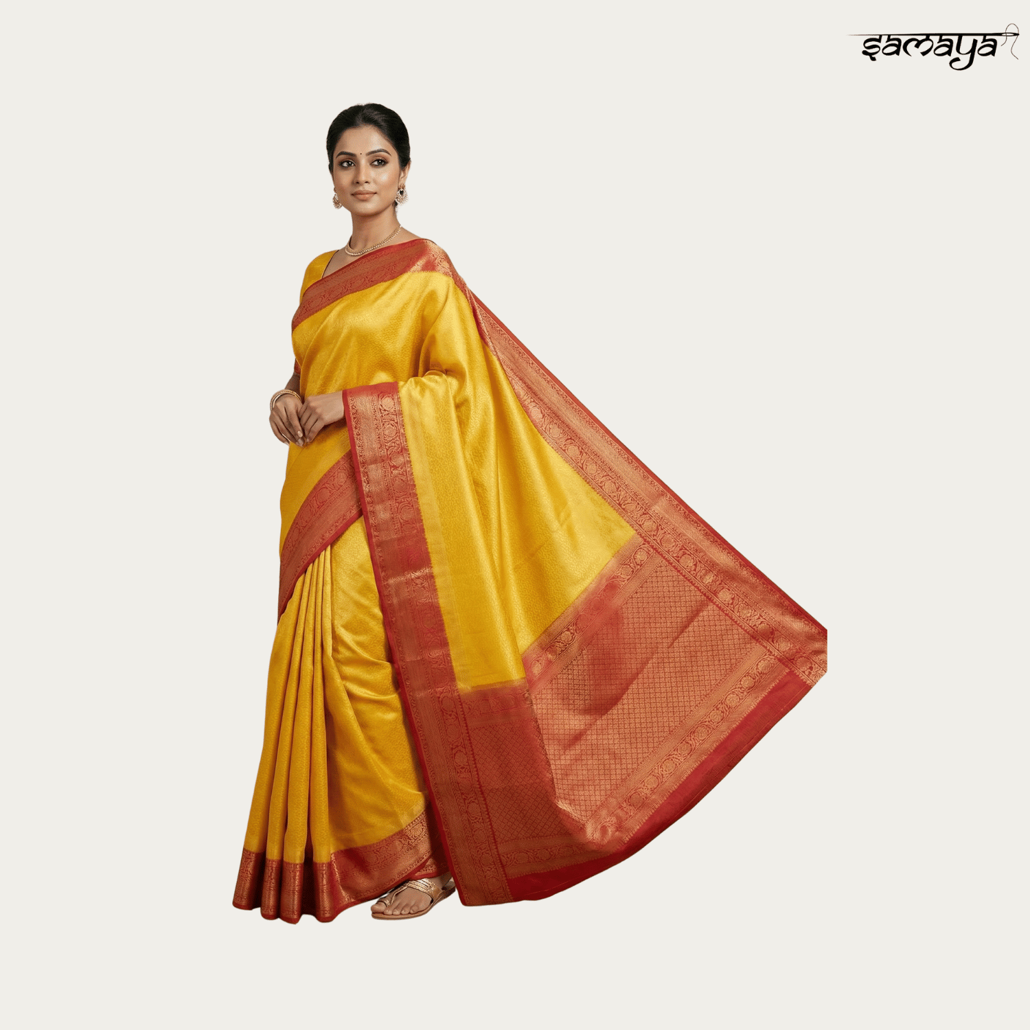 Mustard Yellow Banarasi Silk Saree with Red Border for Wedding