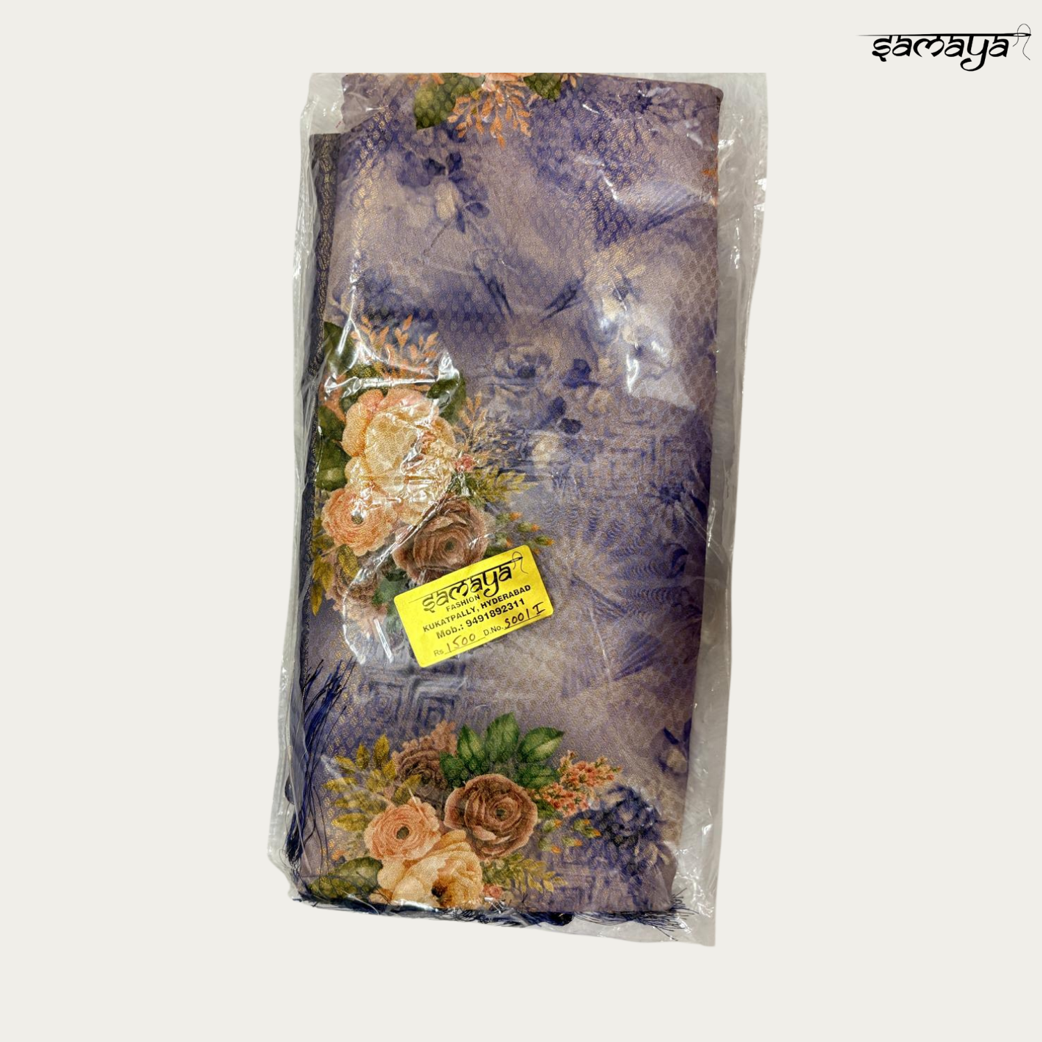 Overview: The Lavender Printed Silk Saree is a graceful blend of soft color palettes and rich traditional detailing, designed for women across all age groups who enjoy elegant yet contemporary ethnic wear. Featuring soothing lavender and mauve tones with a watercolor-style floral print, this saree is elevated by a striking deep purple contrast border woven with gold zari. It is an ideal choice for evening parties, festive celebrations, and wedding guest appearances where subtle glamour and refined craftsmanship are appreciated. The saree balances modern aesthetics with classic Indian weaving, making it both stylish and timeless. Key Highlights: Soft lavender and mauve base with a trendy watercolor and tie-dye inspired effect. Premium blended silk and art silk fabric offering a smooth feel and elegant sheen. All-over digital floral print featuring roses for a feminine, modern appeal. Wide deep purple contrast border enriched with intricate gold zari woven patterns. A perfect fusion of contemporary prints and traditional Indian craftsmanship. Fabric Story: Crafted from a high-quality blended silk and art silk composition, the fabric feels lightweight, breathable, and soft against the skin. It delivers a graceful flow with a subtle shine, making it comfortable for extended wear during parties and festive occasions. Design & Craftsmanship: The saree showcases a layered digital floral print placed over a watercolor-inspired background, adding depth and visual interest. This modern design is beautifully anchored by a wide, traditionally woven deep purple border with gold zari motifs, reflecting skilled craftsmanship and cultural richness. Drape Feel: The smooth texture and light weight of the silk blend ensure an effortless and fluid drape. It falls gracefully, holds pleats neatly, and enhances the silhouette, allowing confident movement and comfort throughout the event. Occasion Suitability: Perfect for party wear, festive celebrations, evening events, wedding guest functions, and semi-formal traditional gatherings where a modern yet elegant saree is preferred. Styling Suggestions: Style this saree with delicate gold jewelry, pearl accents, or oxidized silver pieces to complement the zari work. Opt for a soft romantic bun or loose waves, paired with block heels or metallic sandals for a polished party-ready look. Why Buyers Love It: Buyers love the unique lavender shade combined with the contrast of a bold purple zari border, creating a premium soft silk saree look with a fashionable edge. Samaya Fashion ensures a seamless shopping experience with fast delivery across India, free shipping, easy returns, cash on delivery, and dependable 24x7 customer support, making this saree a confident choice for festive and party wear.