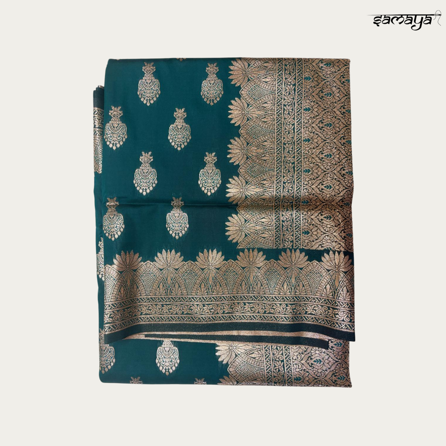 Overview: This bottle green Banarasi silk saree is a perfect blend of royal elegance and traditional charm, designed for women who appreciate rich Indian heritage. Suitable for all age groups, this saree enhances grace and confidence with its deep green tone and luxurious gold detailing. It is an ideal choice for weddings, festive celebrations, receptions, and special family occasions where timeless style matters. Key Highlights: Premium Banarasi silk with classic gold zari weaving Elegant bottle green shade with rich festive appeal Traditional motifs with ornate border and pallu Perfect wedding and festive silk saree Fabric Story: Made from high-quality Banarasi silk, this saree feels smooth, rich, and luxurious against the skin. The breathable silk fabric ensures lasting comfort while maintaining a regal sheen throughout the day or evening. Design & Craftsmanship: The saree showcases traditional Banarasi motifs woven with intricate gold zari inspired by Indian cultural artistry. The broad decorative border and detailed pallu add depth, richness, and an unmistakable heritage touch. Drape Feel: This silk saree drapes beautifully with well-defined pleats and a graceful fall. Its balanced weight provides structure and comfort, allowing you to move confidently during long ceremonies and celebrations. Occasion Suitability: Ideal for weddings, bridal events, festive gatherings, receptions, temple visits, and traditional functions. It also suits milestone family celebrations where elegance and tradition are key. Styling Suggestions: Style this wedding saree with a matching green or gold silk blouse, antique or temple jewelry, and a classic bun or soft curls. Complete the look with embellished heels or traditional sandals. Why Buyers Love It: Buyers love this saree for its rich color, authentic Banarasi craftsmanship, and timeless design that never goes out of fashion. Shopping with Samaya Fashion means fast delivery across India, free shipping, easy returns, cash on delivery, and dependable 24x7 customer support.
