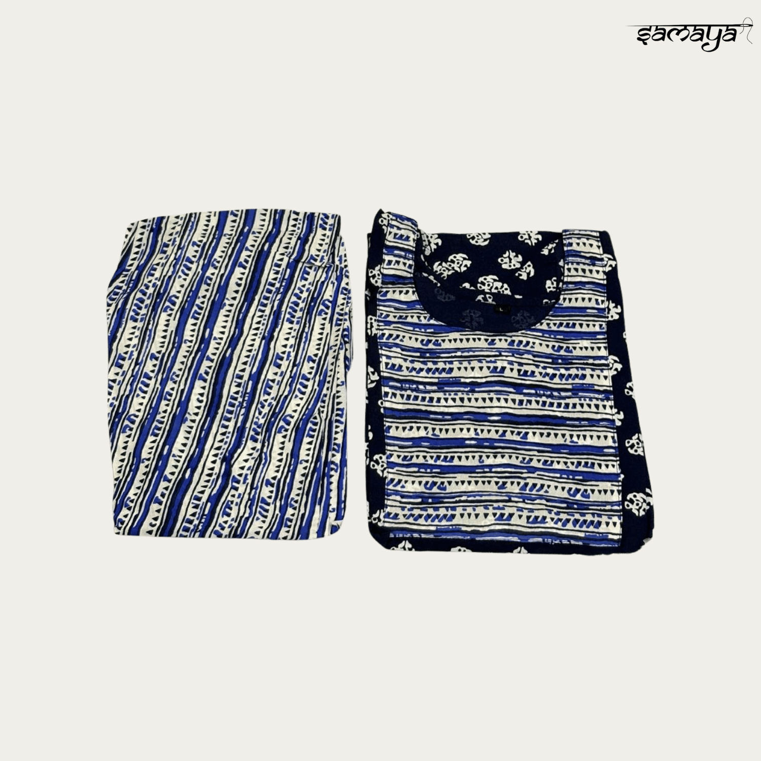 Overview: This navy blue printed cotton kurti set is designed for women who prefer classic colors paired with effortless everyday comfort. The deep navy base enhanced with subtle white ethnic motifs gives the outfit a timeless, refined appeal suitable across age groups. Ideal for office wear, daily routines, and casual outings, this kurti set blends traditional Indian aesthetics with modern functionality. Key Highlights: Soft, breathable cotton fabric for all-day comfort Elegant all-over ethnic print with contrast yoke design Straight-cut kurti with three-quarter sleeves Coordinated printed pants for a complete look Easy-maintenance fabric suitable for regular wear Fabric Story: Crafted from quality cotton, this kurti set feels light, airy, and gentle on the skin. The breathable fabric is ideal for Indian weather, keeping you comfortable through long work hours while maintaining a crisp, structured look. Design & Craftsmanship: The kurti features delicate traditional motifs evenly distributed across the body, creating a balanced and graceful pattern. The contrast yoke with linear detailing adds visual depth and a touch of contemporary styling, while matching sleeve borders enhance the overall finish. Fit & Comfort (for kurtis): The straight-fit silhouette offers a relaxed yet flattering fall that suits most body types. Paired with comfortable printed pants, the set allows easy movement and ensures confidence throughout busy days. Occasion Suitability: Perfect for office wear, daily wear, work-from-home schedules, casual outings, travel, and informal daytime gatherings. Its classic color palette also works well for minimal festive mornings and semi-formal occasions. Styling Suggestions: Style this kurti set with oxidized silver earrings or simple studs for a clean, professional look. Pair with flat sandals or low wedges, and keep hair neatly tied or softly styled for understated elegance. Why Buyers Love It: Buyers appreciate this cotton kurti set for its breathable fabric, classic navy blue color, and versatile design that works perfectly as a daily wear kurti or office kurti. Samaya Fashion builds trust with fast delivery across India, free shipping, easy returns, cash on delivery, and dependable 24x7 customer support, making it a reliable choice for everyday ethnic wear.