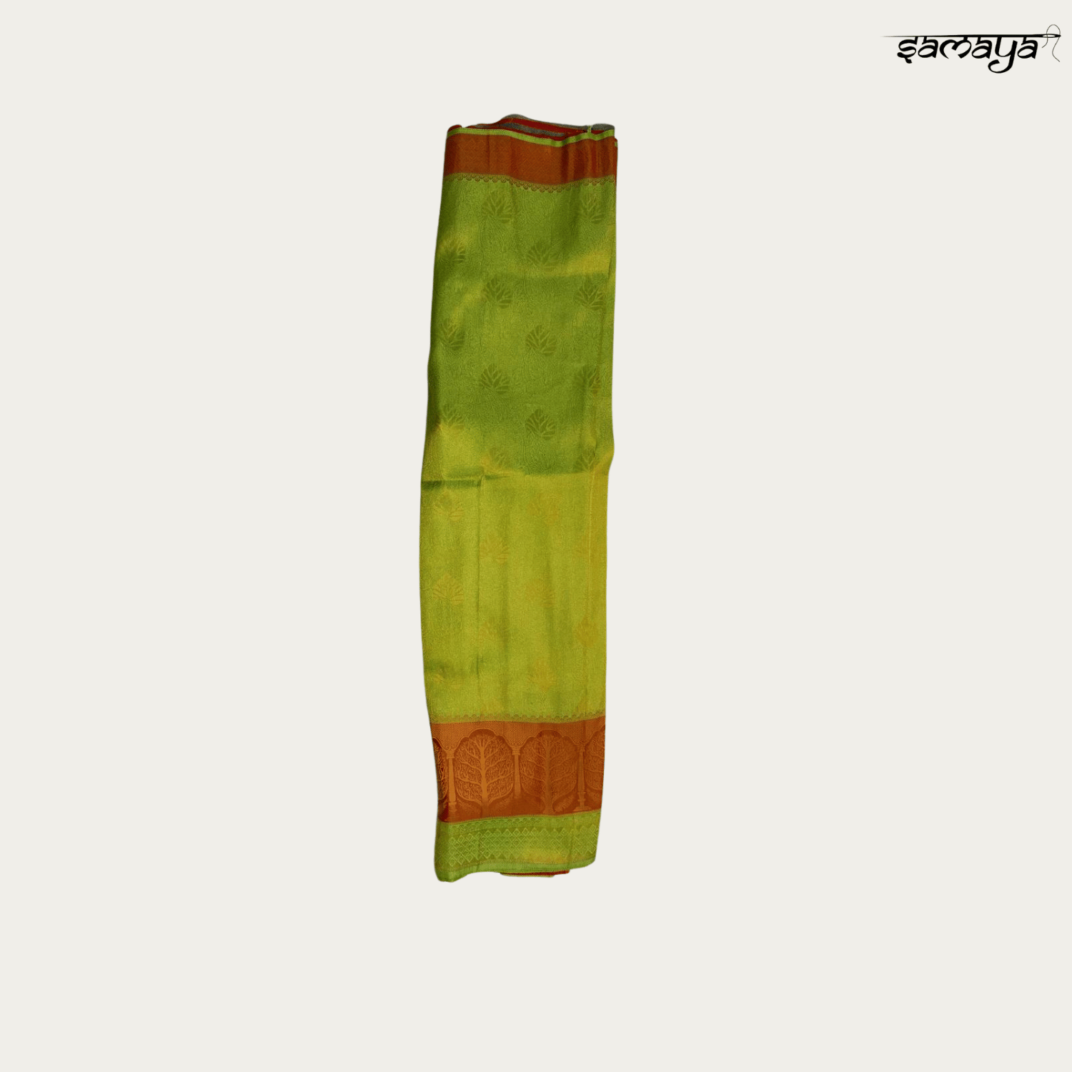 The saree features delicate leaf-like self-motifs scattered across the lime green body, creating a textured look. The broad orange border is intricately woven with traditional temple and floral designs in gold zari, adding a classic touch to the modern color mix.
