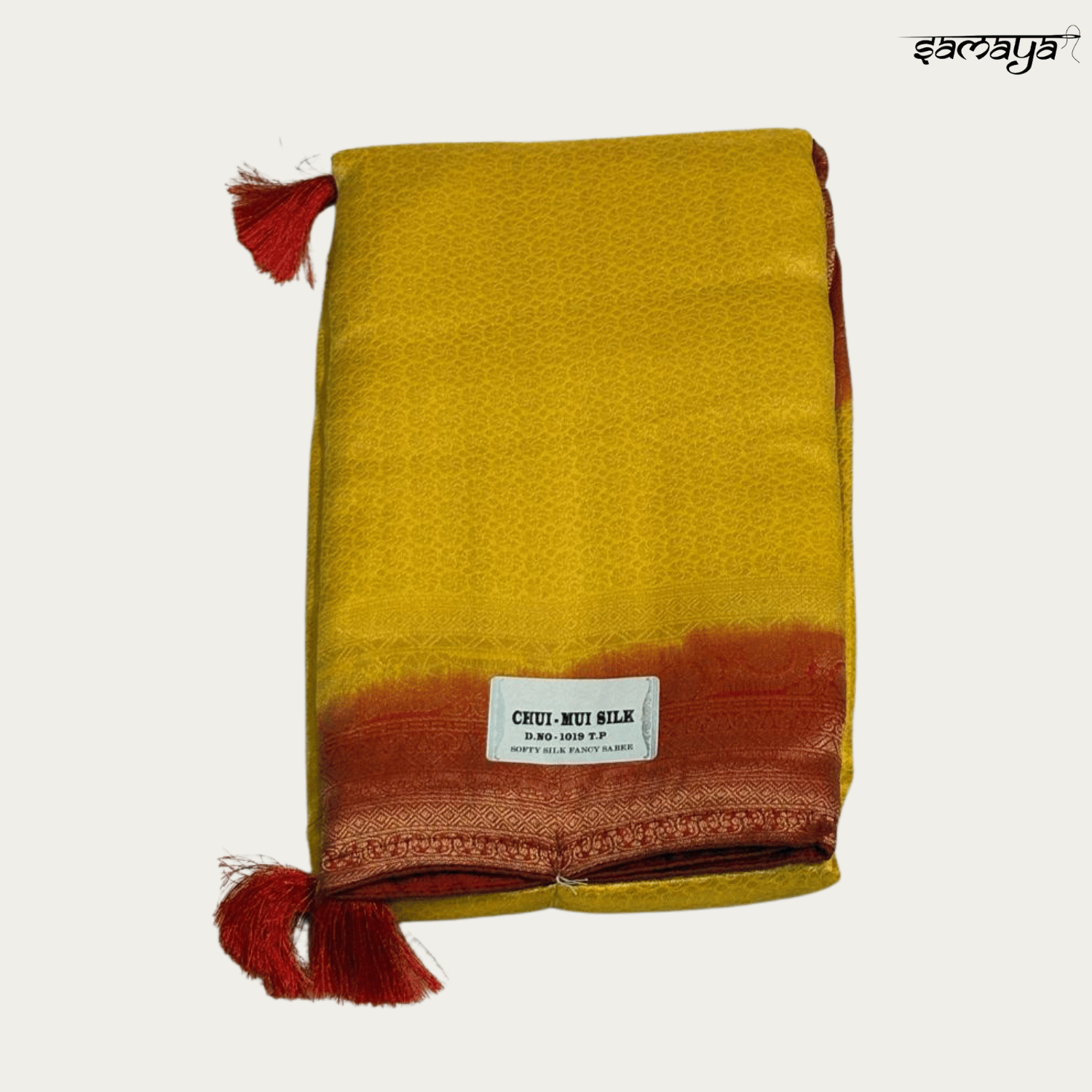Mustard Yellow Banarasi Silk Saree with Red Border for Wedding