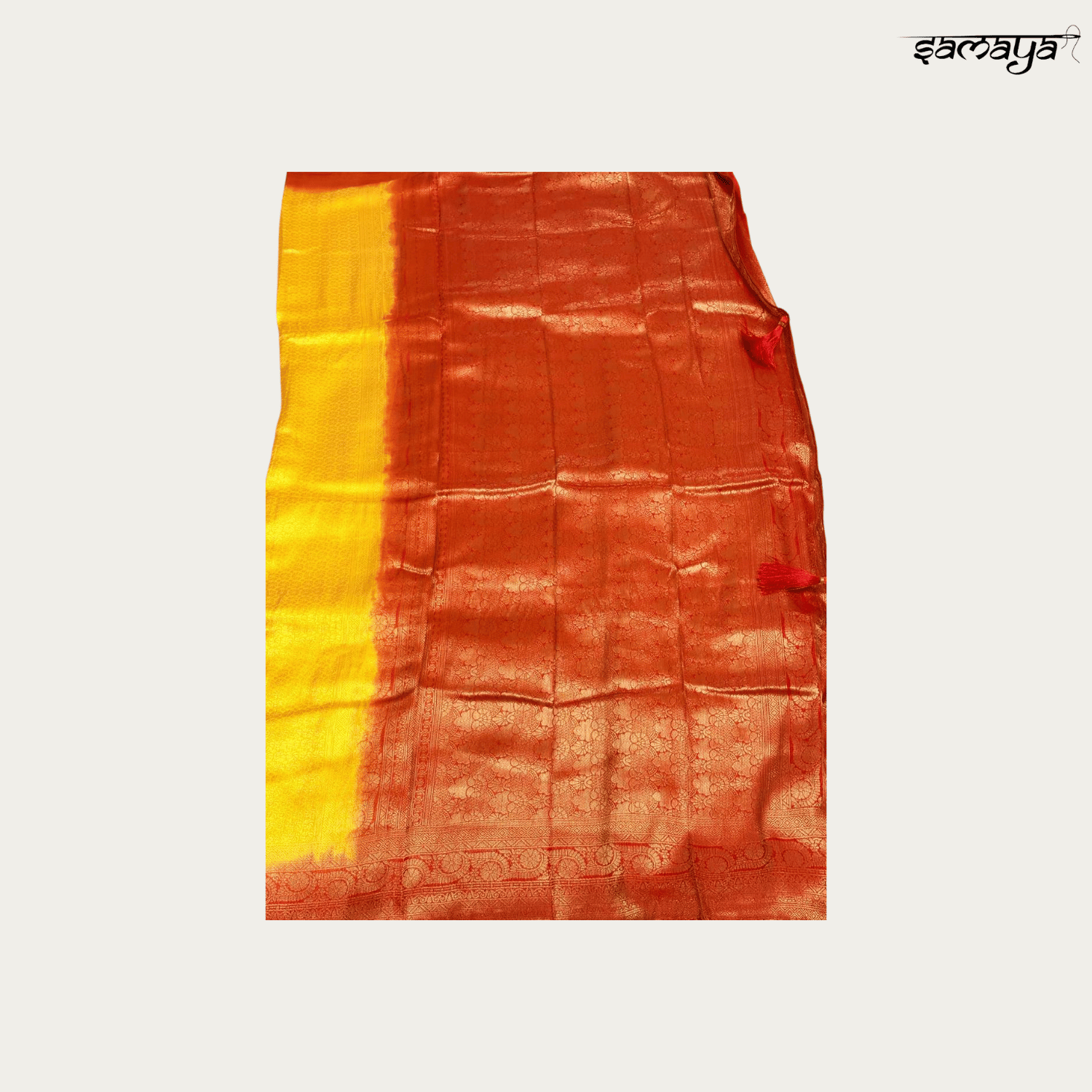 Yellow Red Soft Banarasi Silk Saree Silver Zari for Festive Wear
