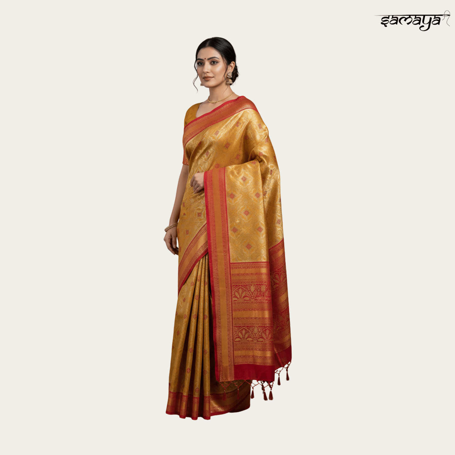 Mustard Yellow Banarasi Silk Saree with Red Border for Wedding