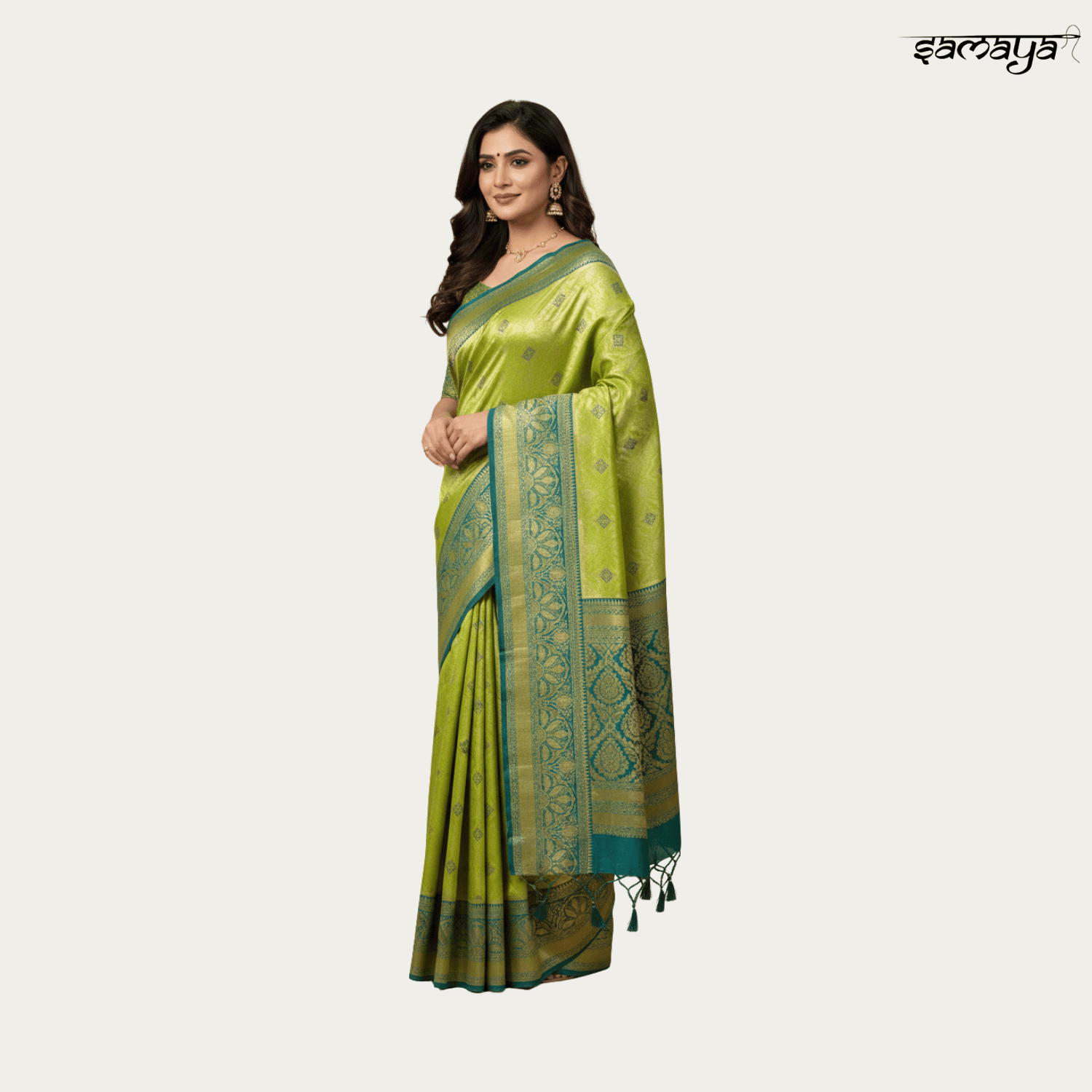 Lime Green Banarasi Silk Saree Gold Zari Woven Motifs Festive Party
