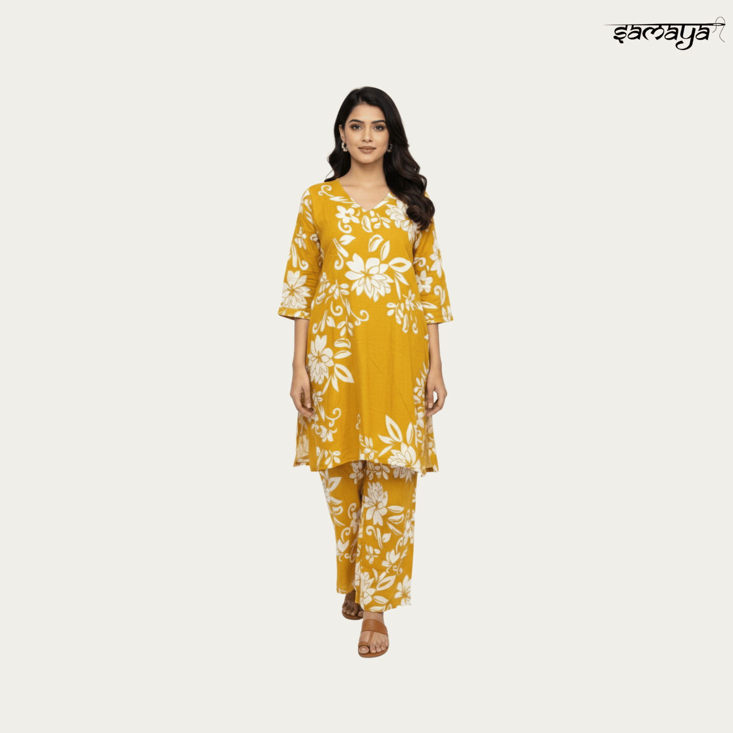Mustard Floral Printed Cotton Kurti Set Festive Daily Wear