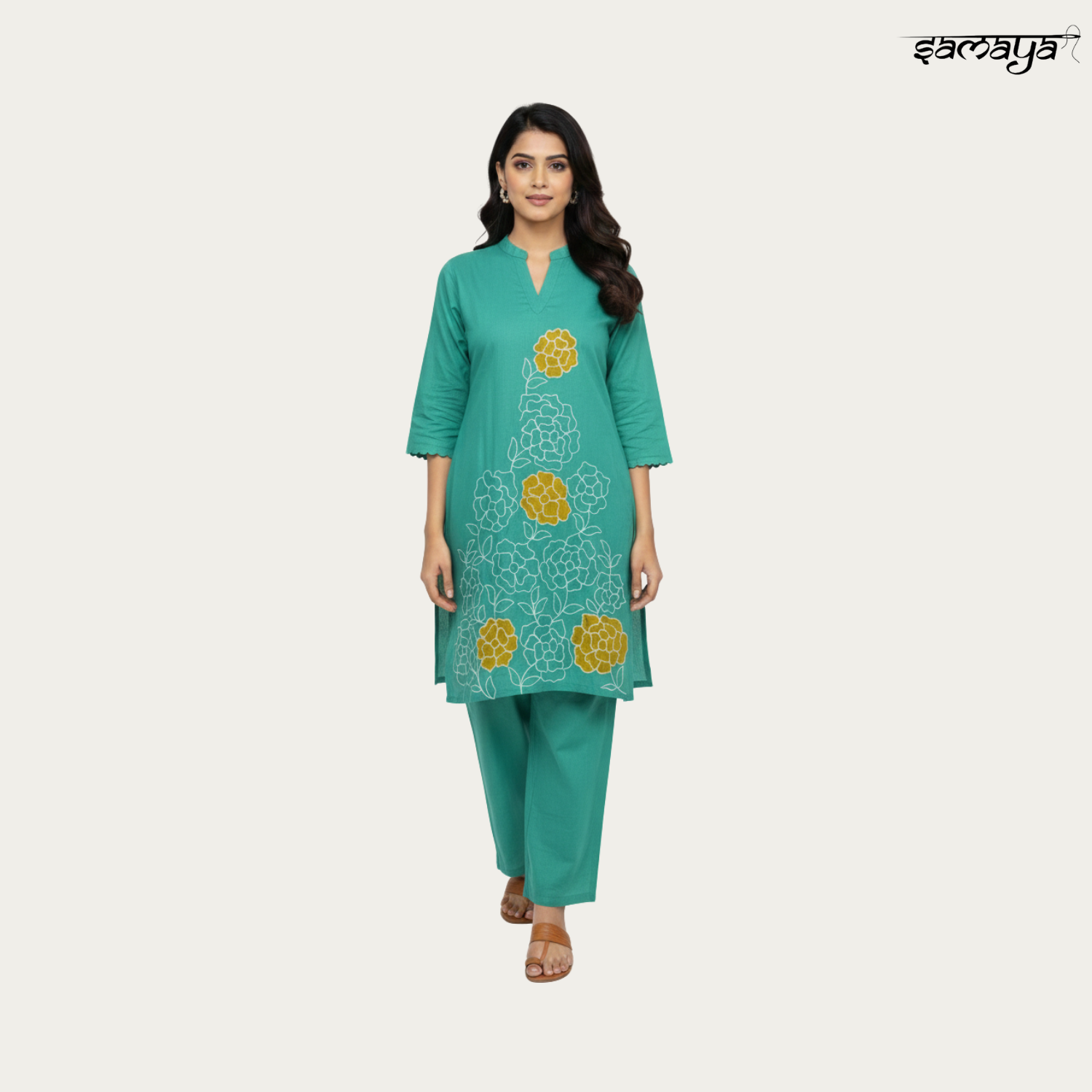 Beige Green Printed Cotton Kurti Set for Office & Festive Wear