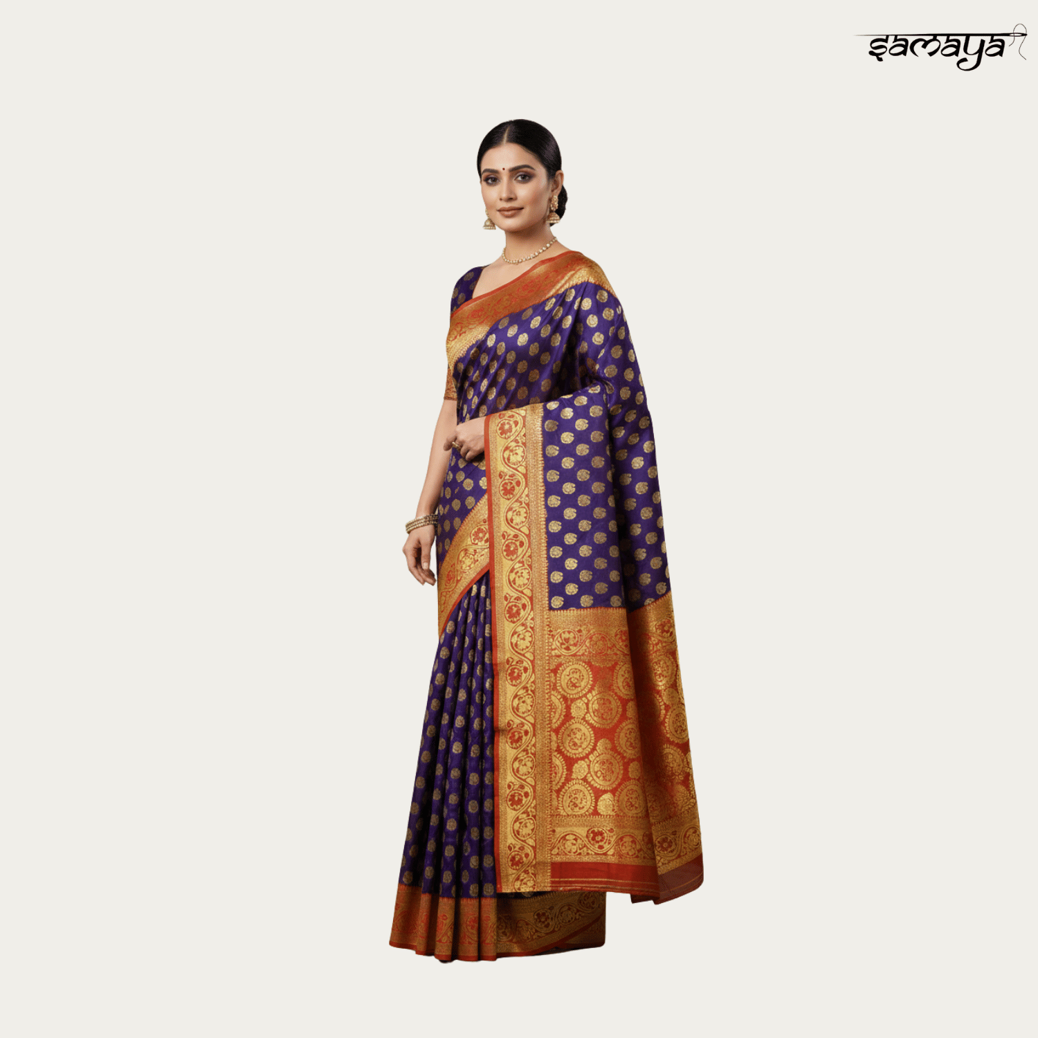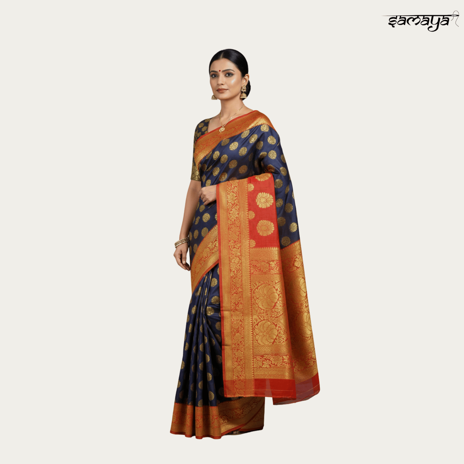 Contrast navy blue border with traditional gold zari work