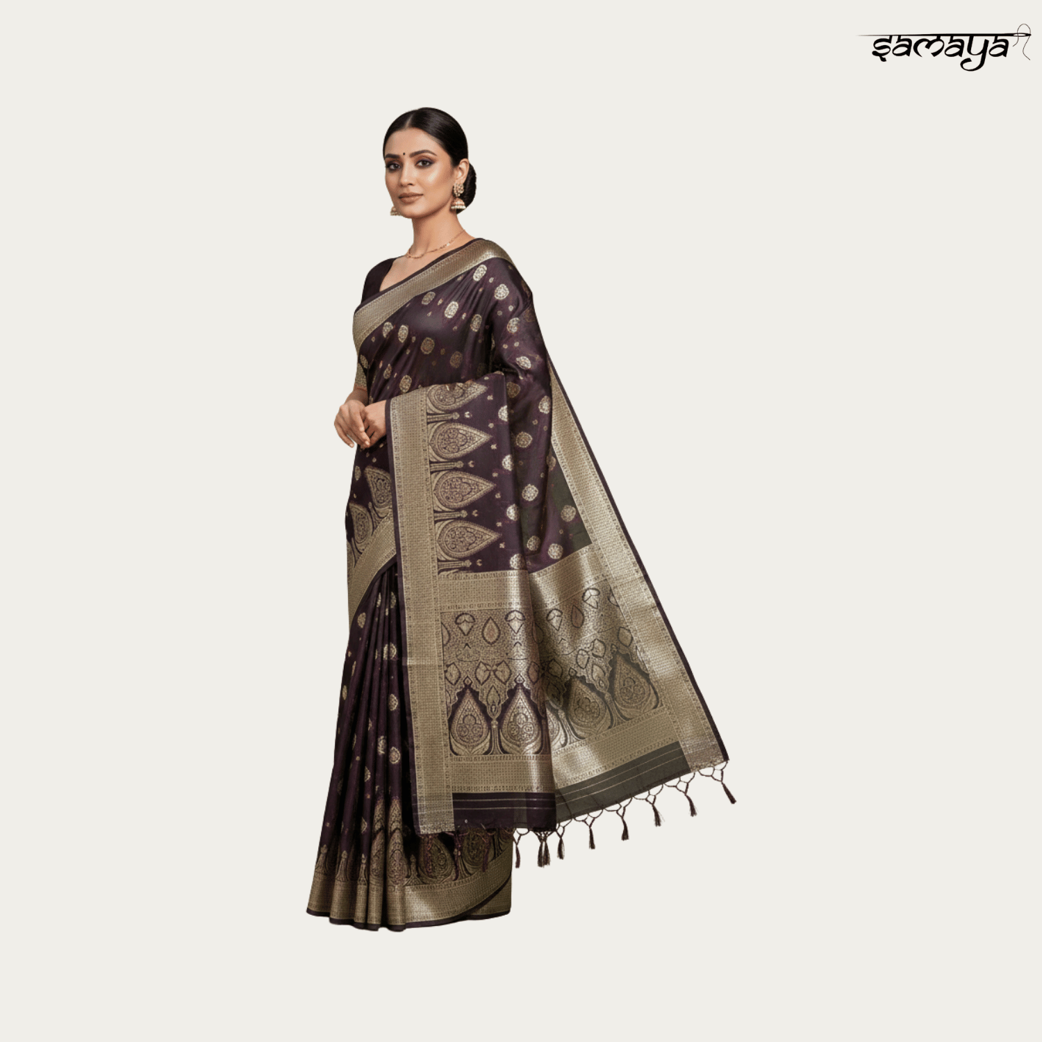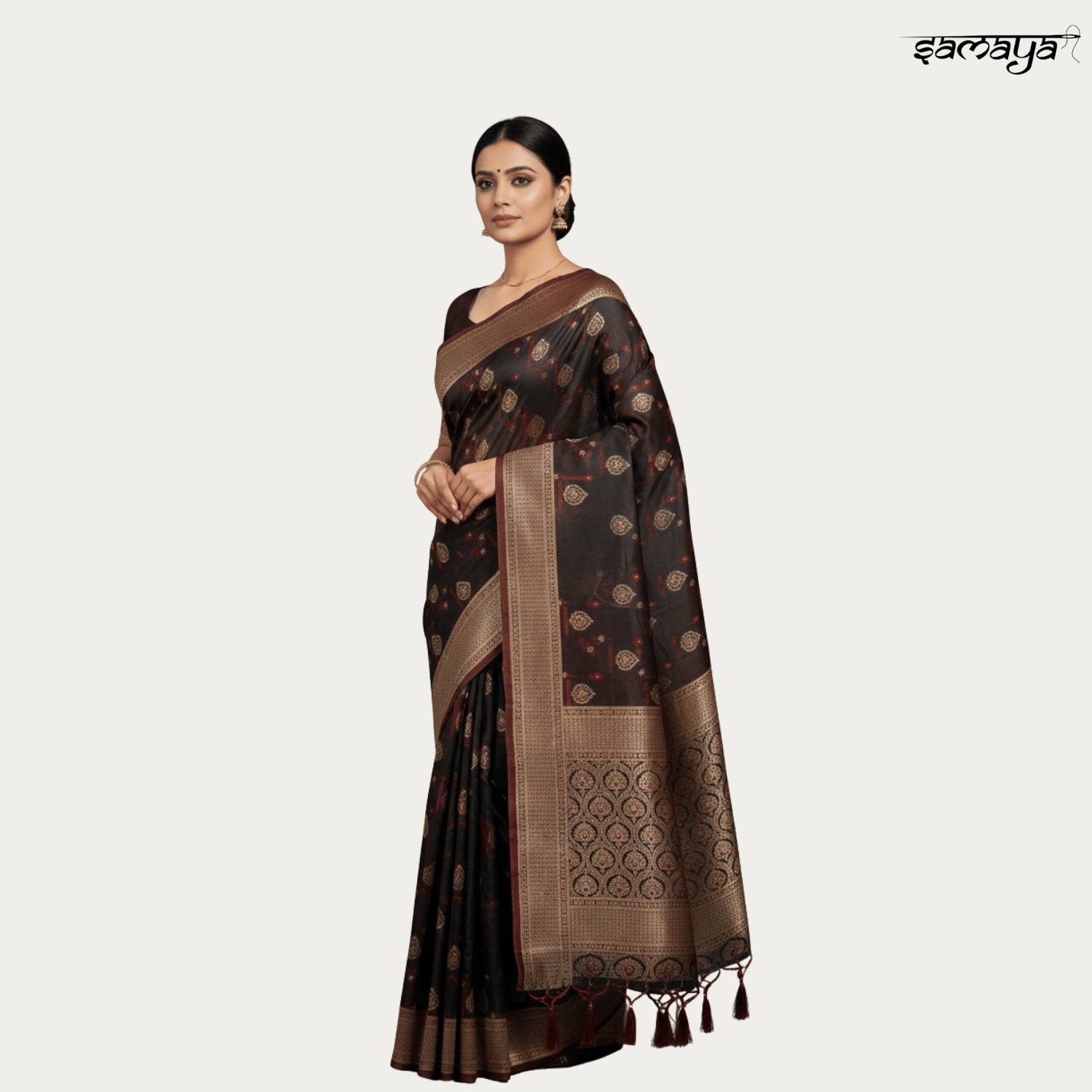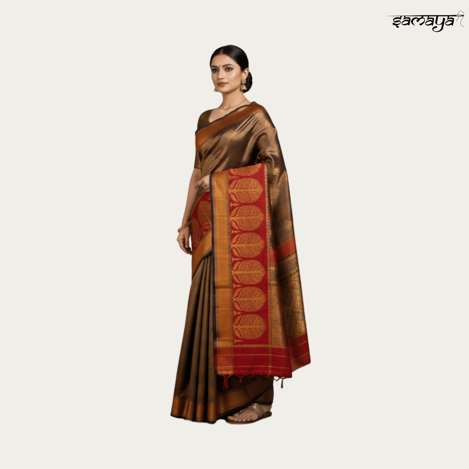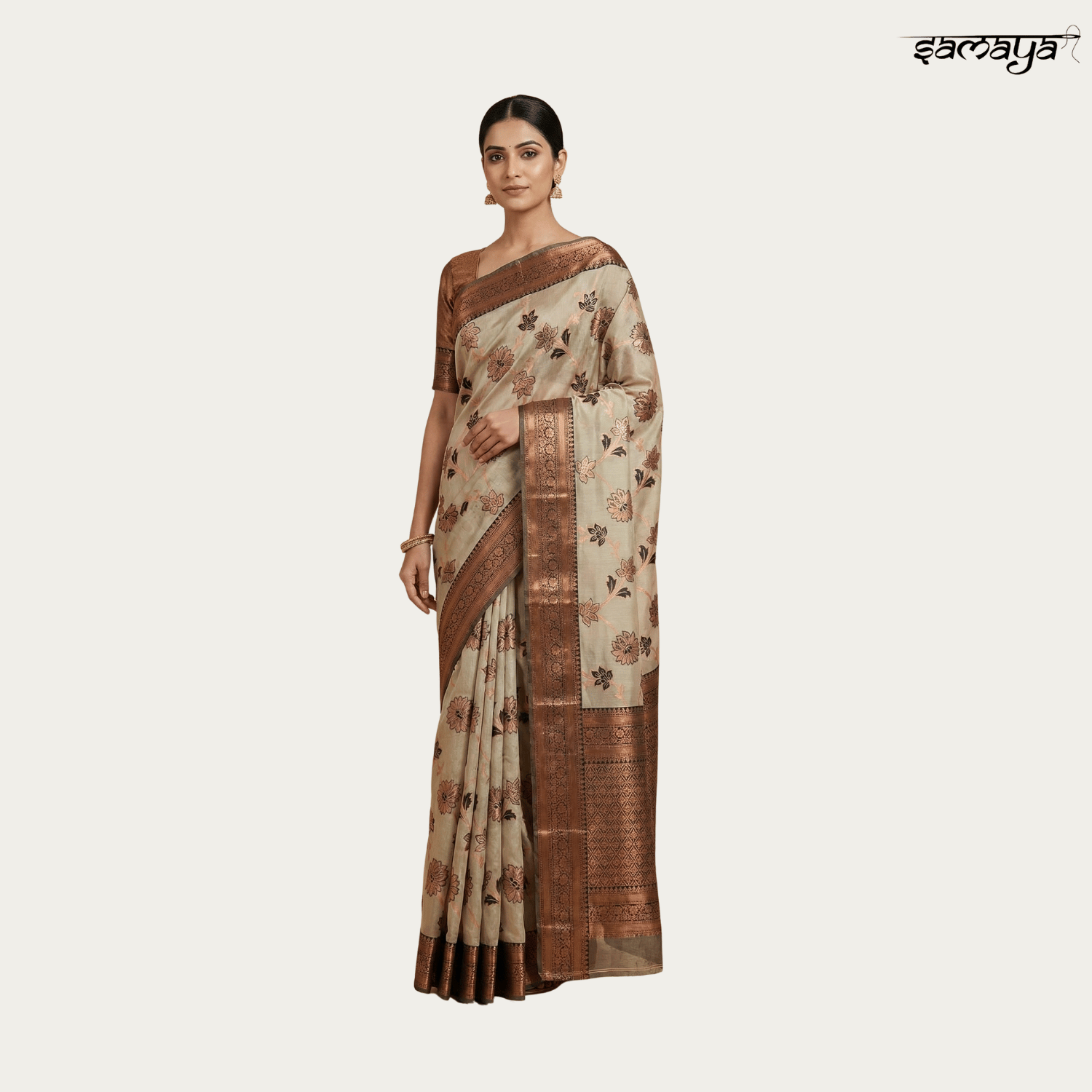 Cream Soft Banarasi Silk Saree with Copper Zari and Chocolate Border