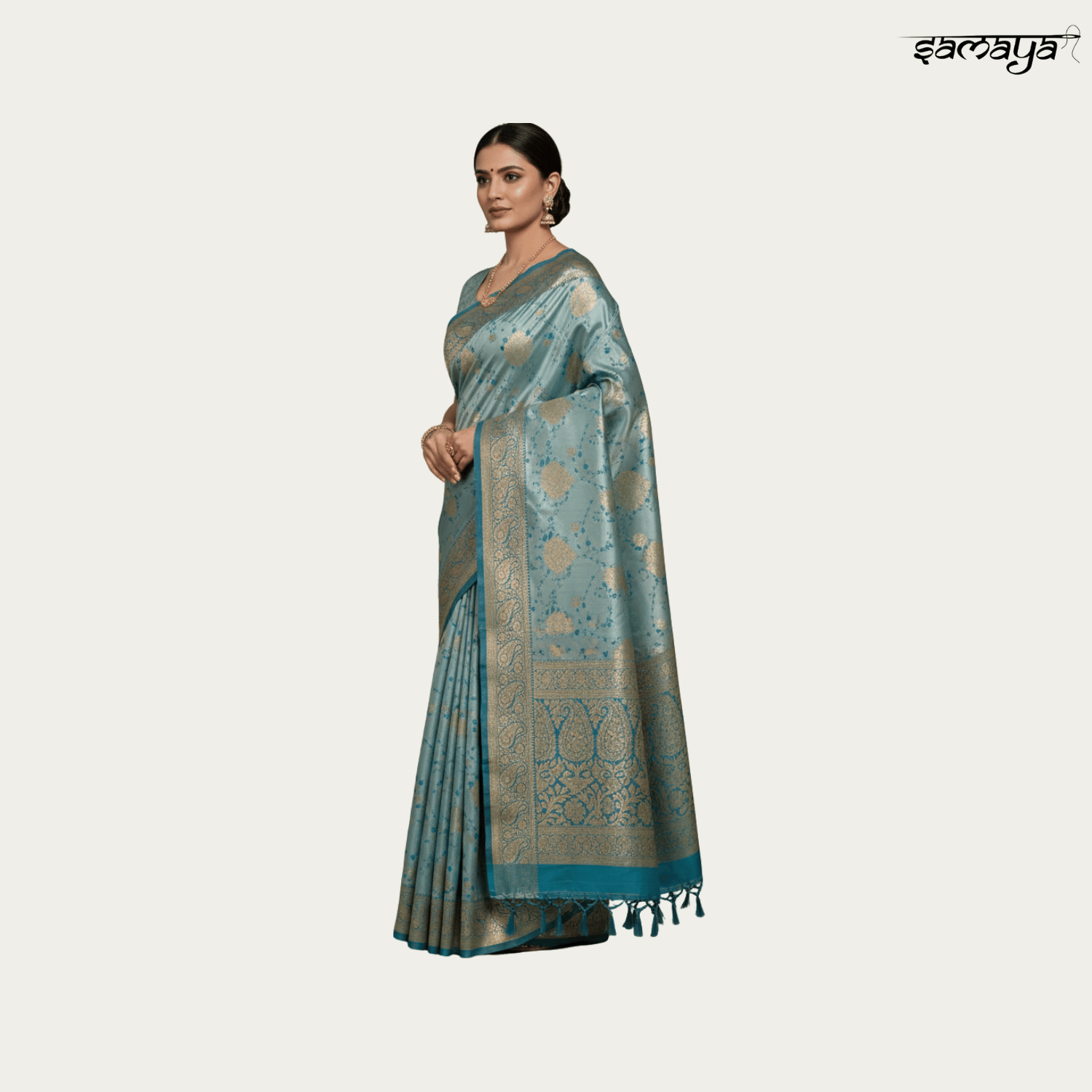 Powder Blue Banarasi Katan Silk Saree with Gold Zari Floral Jaal