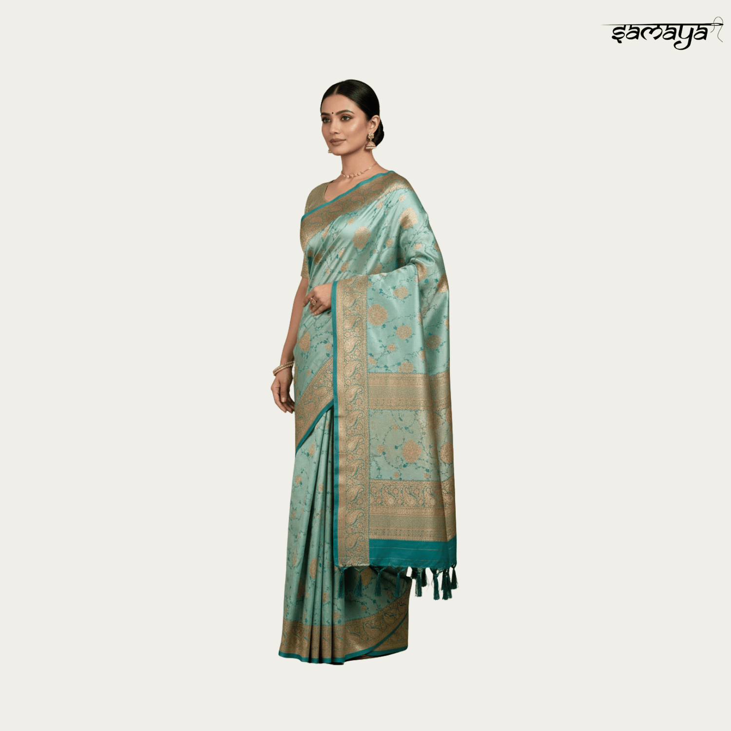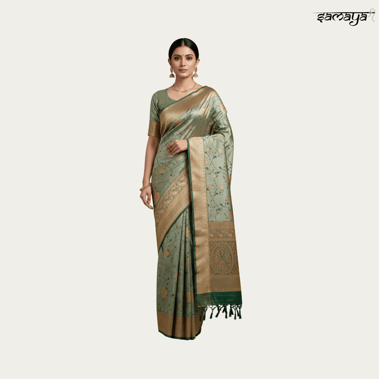 Sea Green Banarasi Soft Silk Saree with Gold Zari Floral Vines