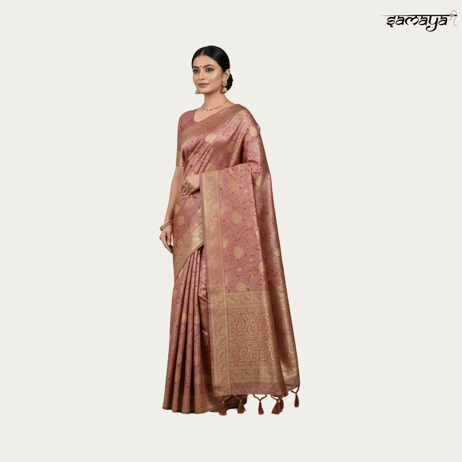 Dusty Pink Banarasi Soft Silk Saree with Gold Zari Floral Vines