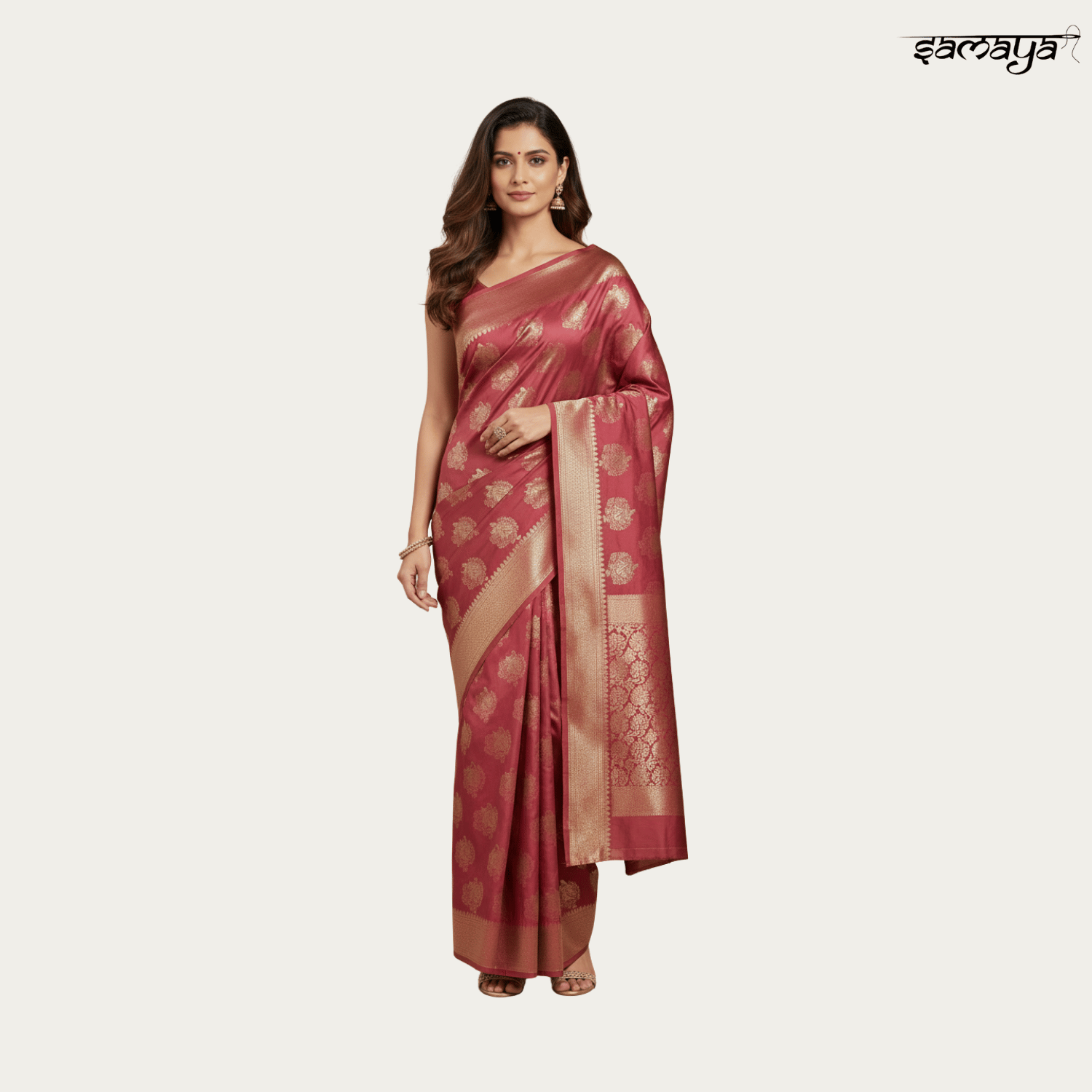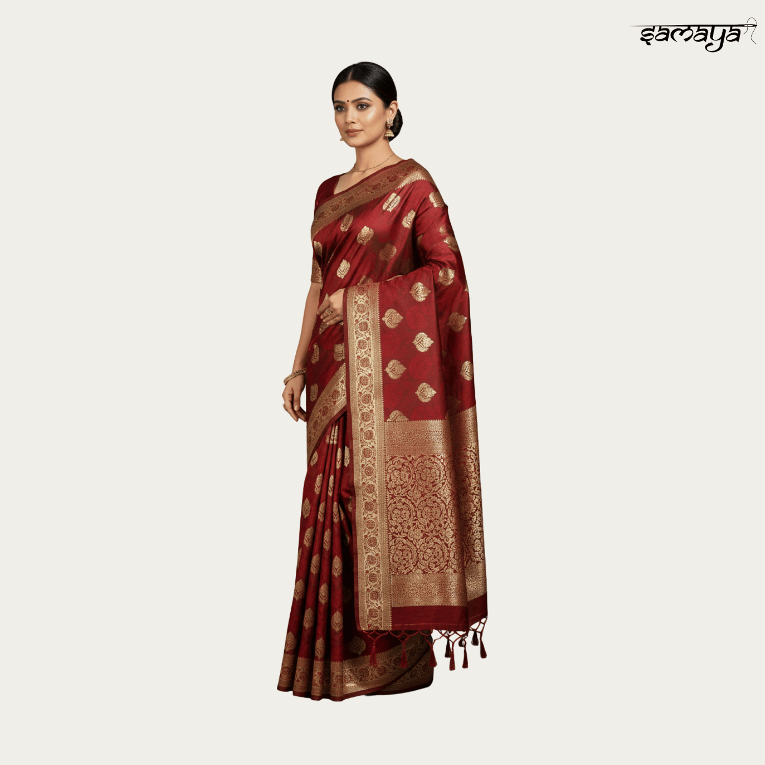 Deep Maroon Banarasi Soft Silk Saree with Gold Zari Floral Buttas