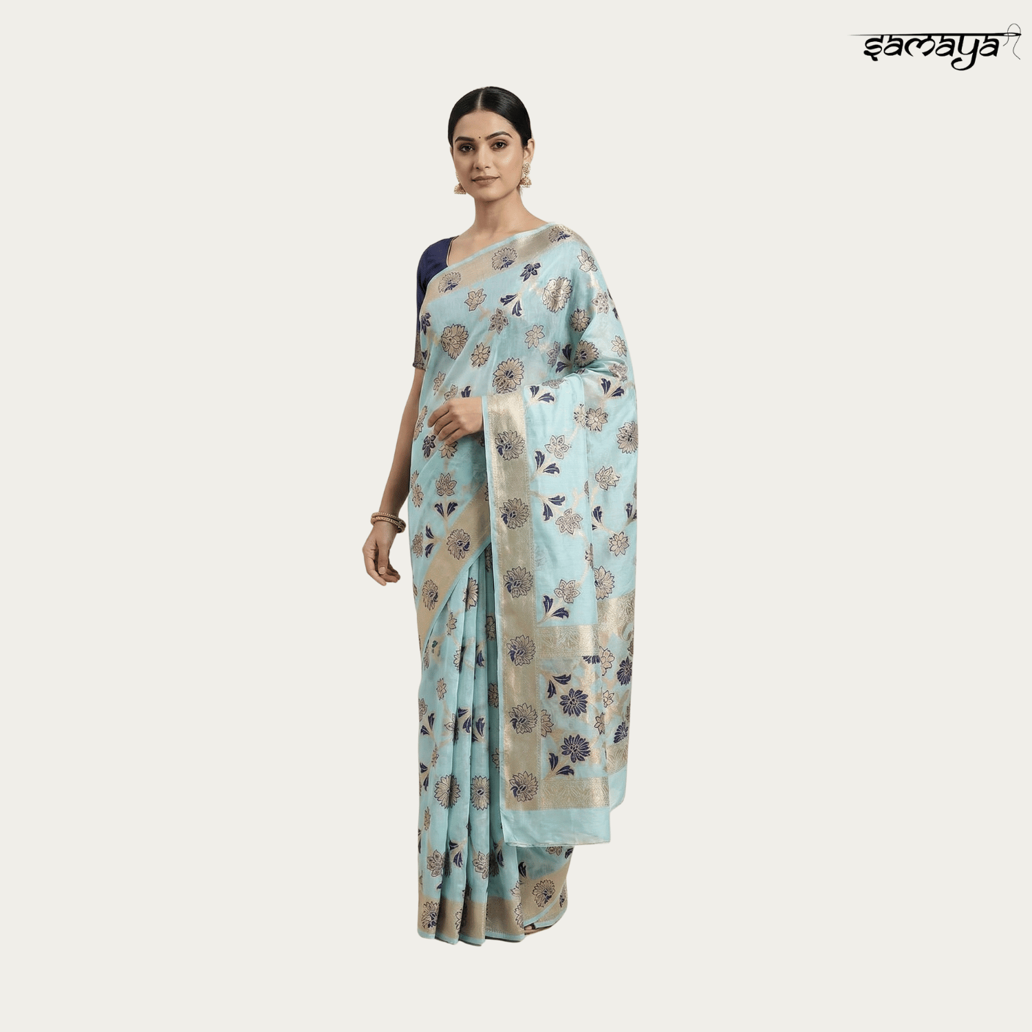 Sky Blue Soft Banarasi Silk Saree with Navy Floral Motifs