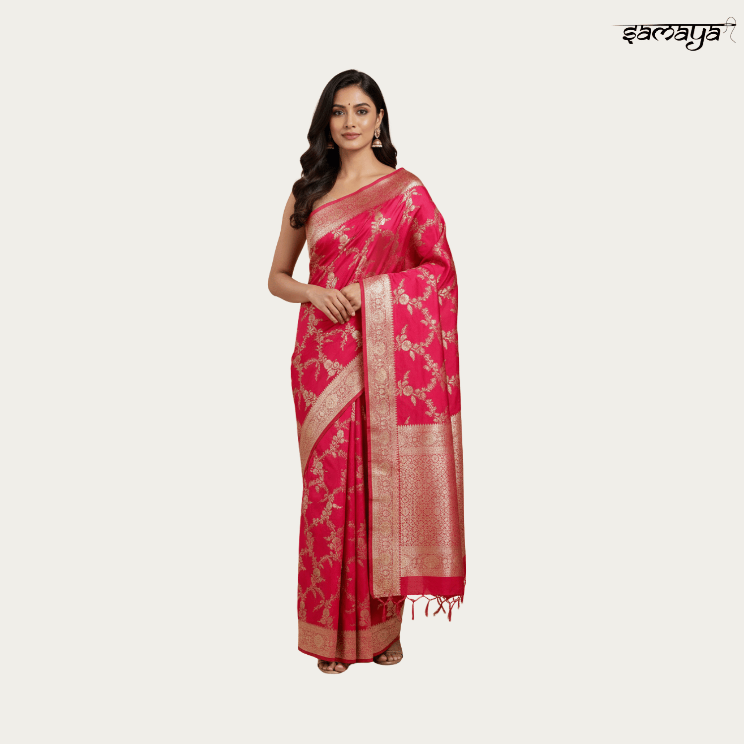 Magenta Pink Banarasi Silk Saree - Gold Zari Floral Vine Wedding Wear