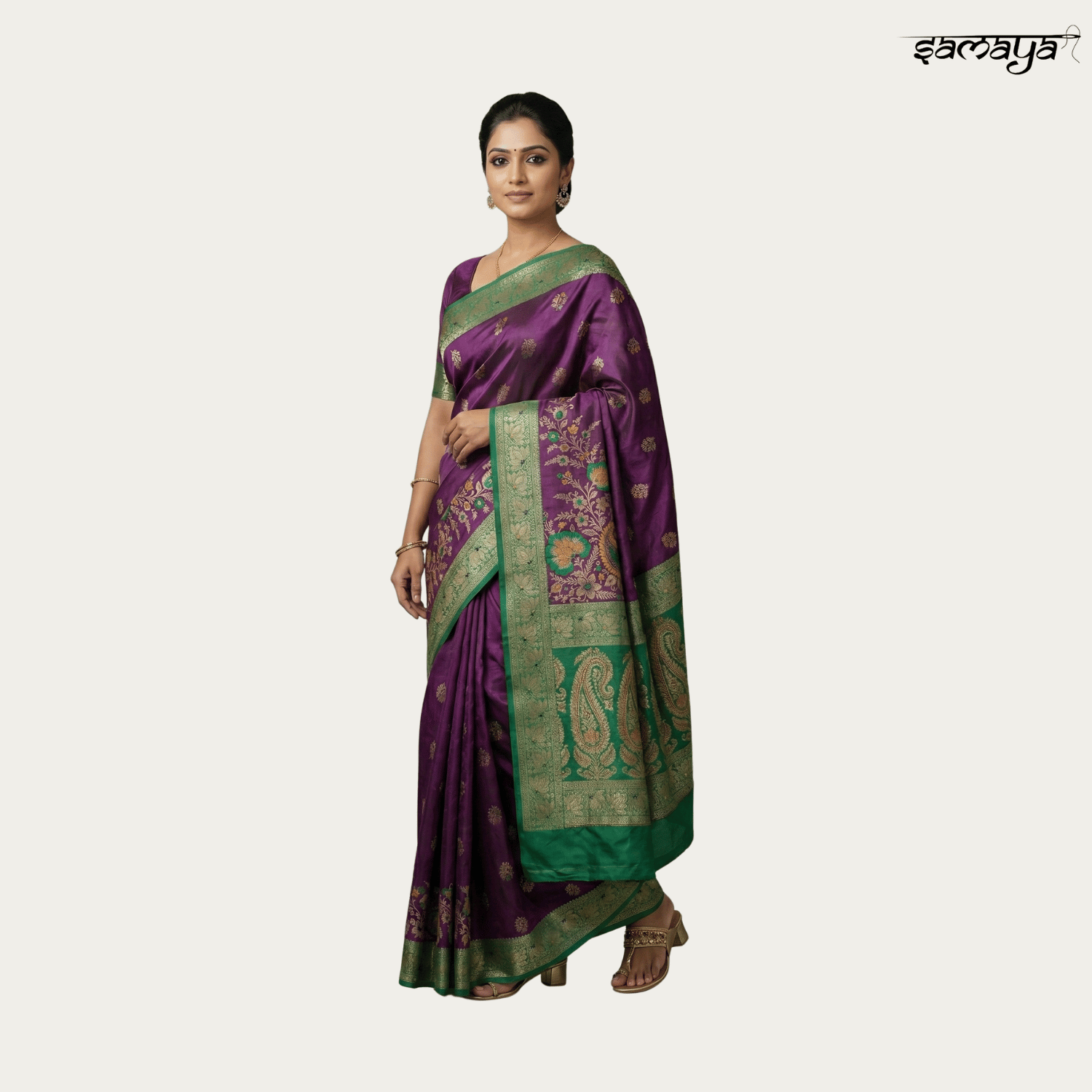 Deep Purple Banarasi Silk Saree with Green Floral Zari Border