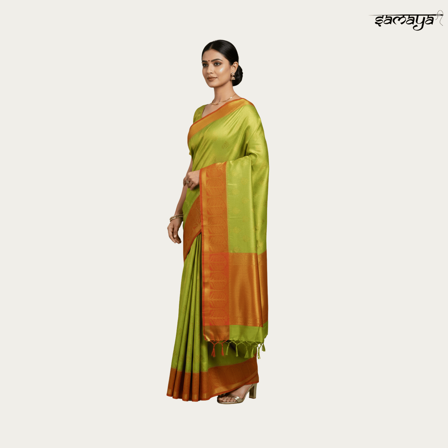 Lime Green Soft Silk Saree with Orange Zari Border for Wedding