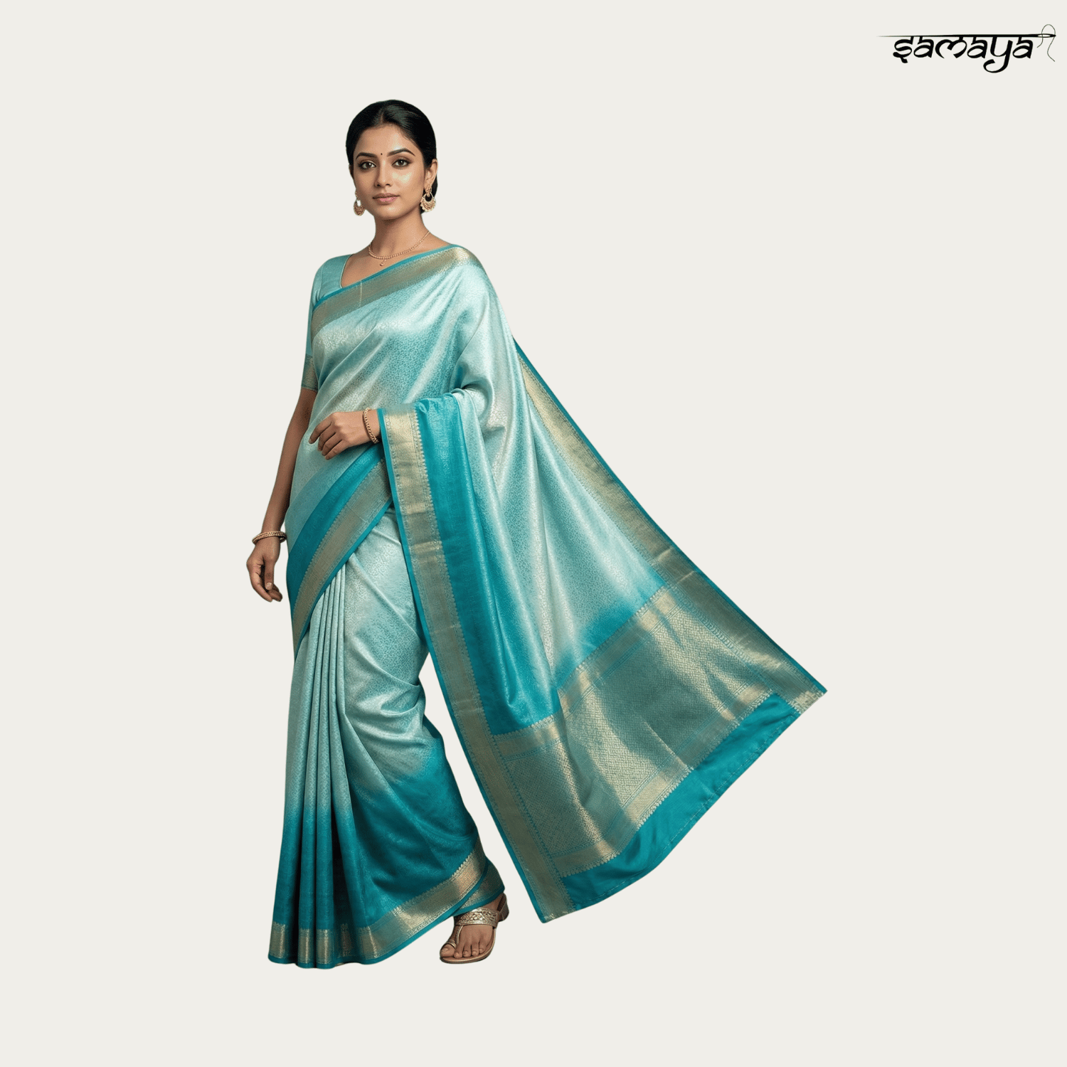 Pair this saree with the contrast navy blouse and silver or pearl jewelry to complement the cool tones. A sleek ponytail or a low bun will add a modern touch, while comfortable block heels will complete the professional ensemble.